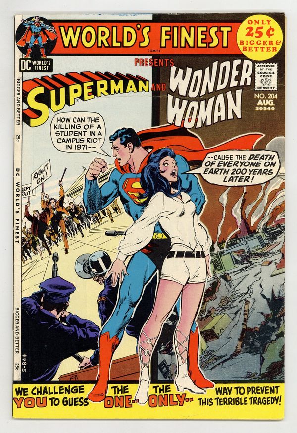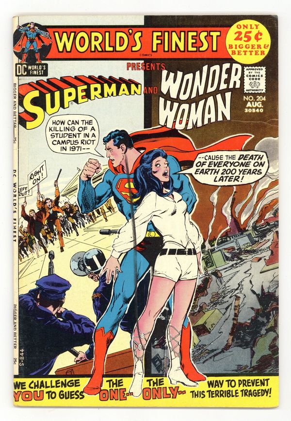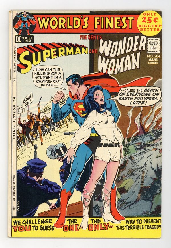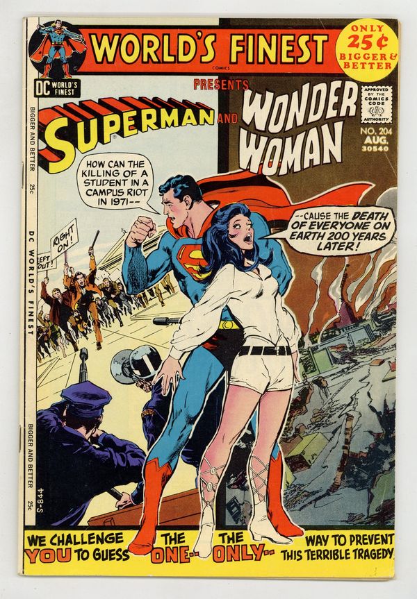 52-page giant. Cover art by Neal Adams. Journey to the End of Hope! starring Superman and Wonder Woman, script by Dennis O'Neil, pencils by Dick Dillin, inks by Joe Giella. The Guardians of the Clockwork Universe! starring Captain Comet, script by John Broome, pencils by Murphy Anderson, inks by Sy Barry. The Rogue of 1000 Ropes! starring Green Arrow, script by Ed Herron, art by George Papp. 52 Pages, Full Color. Cover price $0.25.