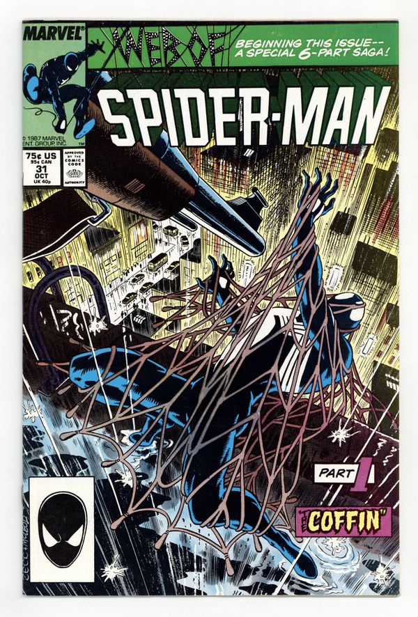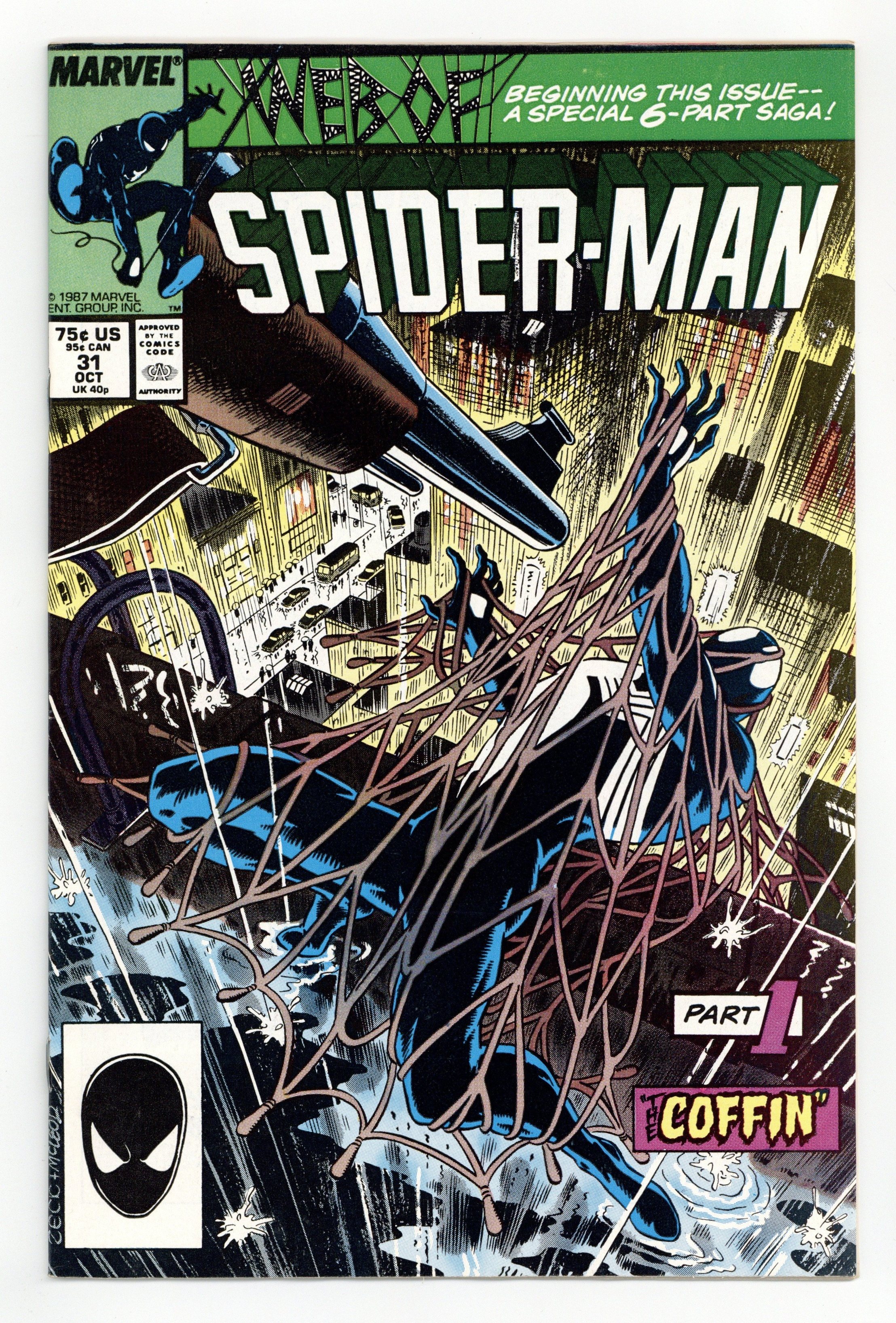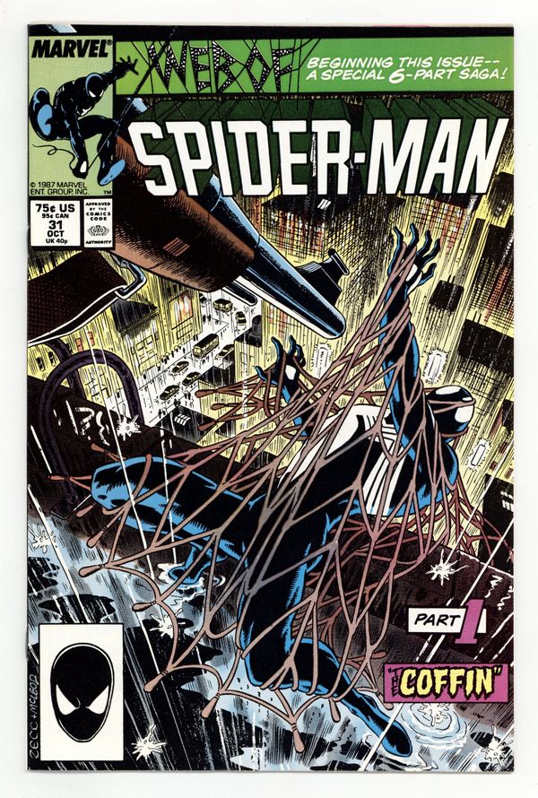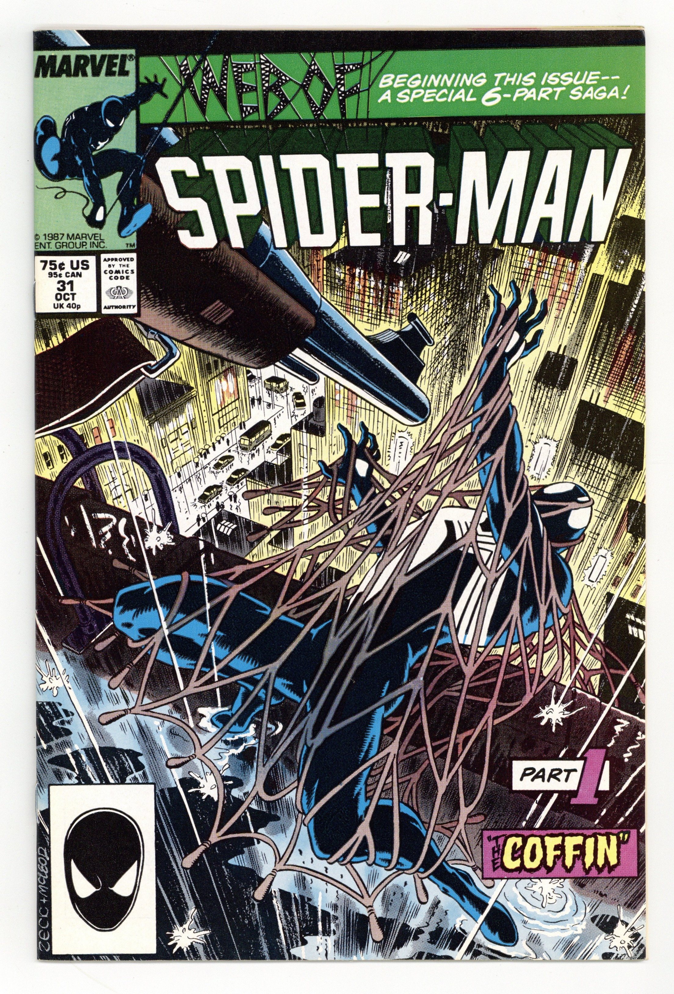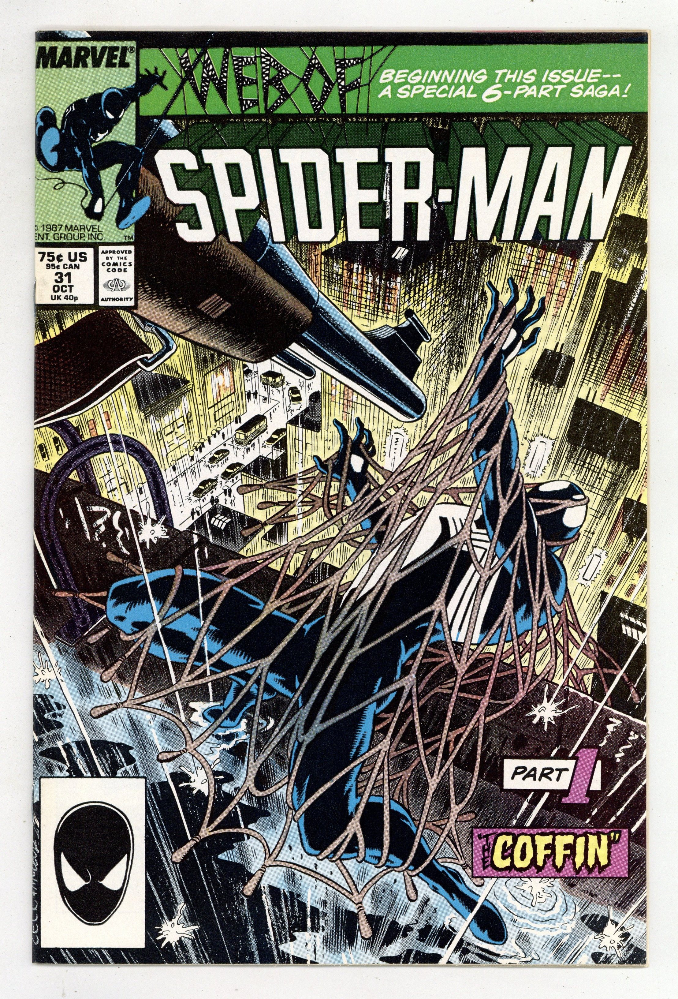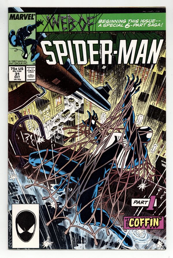 Direct Edition. Kraven's Last Hunt - Part 1 of 6 - "The Coffin" Story by J. M. DeMatteis. Art by Mike Zeck and Bob McLeod. This is the first issue of the Kraven's Last Hunt storyline. A deranged Kraven begins his final quest to exterminate Spider-Man. He ambushes the web-slinger and successfully captures him. Now it appears that a comatose Spider-Man has been buried alive. The situation does not look good. Story continues in Amazing Spiderman 293. 32 pages Cover price $0.75.