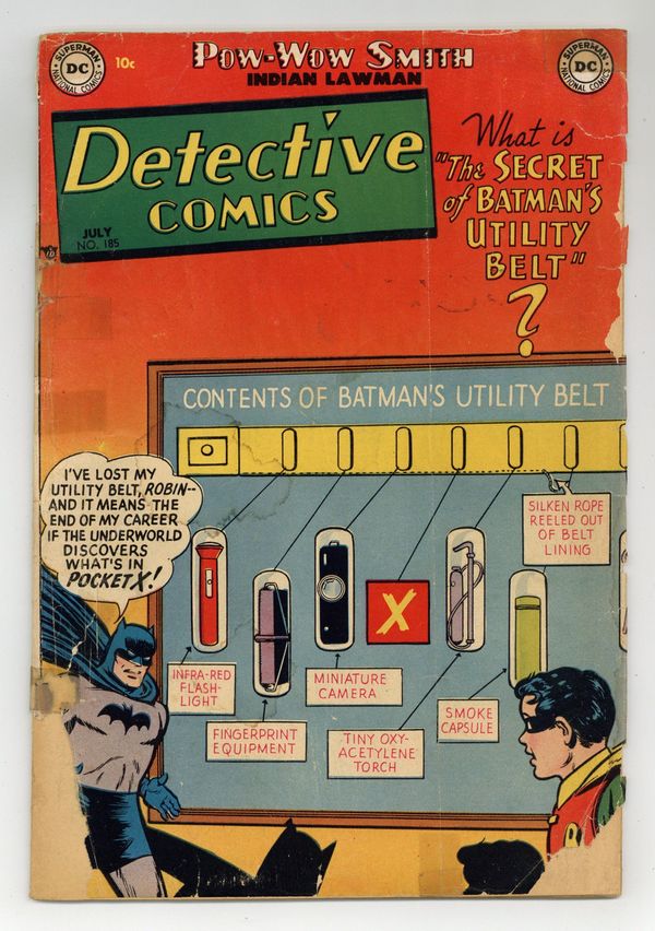 Cover by Win Mortimer. Stories by unknown. Art by Dick Sprang, Charles Paris, Leonard Starr, Ruben Moreira and unknown. Batman's lost his utility belt...and it means the end of his career if the underworld discovers what's in pocket X! Don't miss Batman and Robin in "The Secret of Batman's Utility Belt!" with art by Dick Sprang and Charles Paris. Plus: Pow-Wow Smith, Indian Lawman in "The Man Who Killed Pow-Wow Smith!" with art by Leonard Starr; Robotman in "The Three Impostors!"; and Impossible -- But True! tale "The Case of the Modern Aladdin!" (featuring Roy Raymond) with art by Ruben Moreira. Also: 2-page text piece "He Foresaw Wonders" by David Kahn. 44 pages, full color. Cover price $0.10.