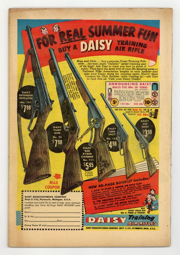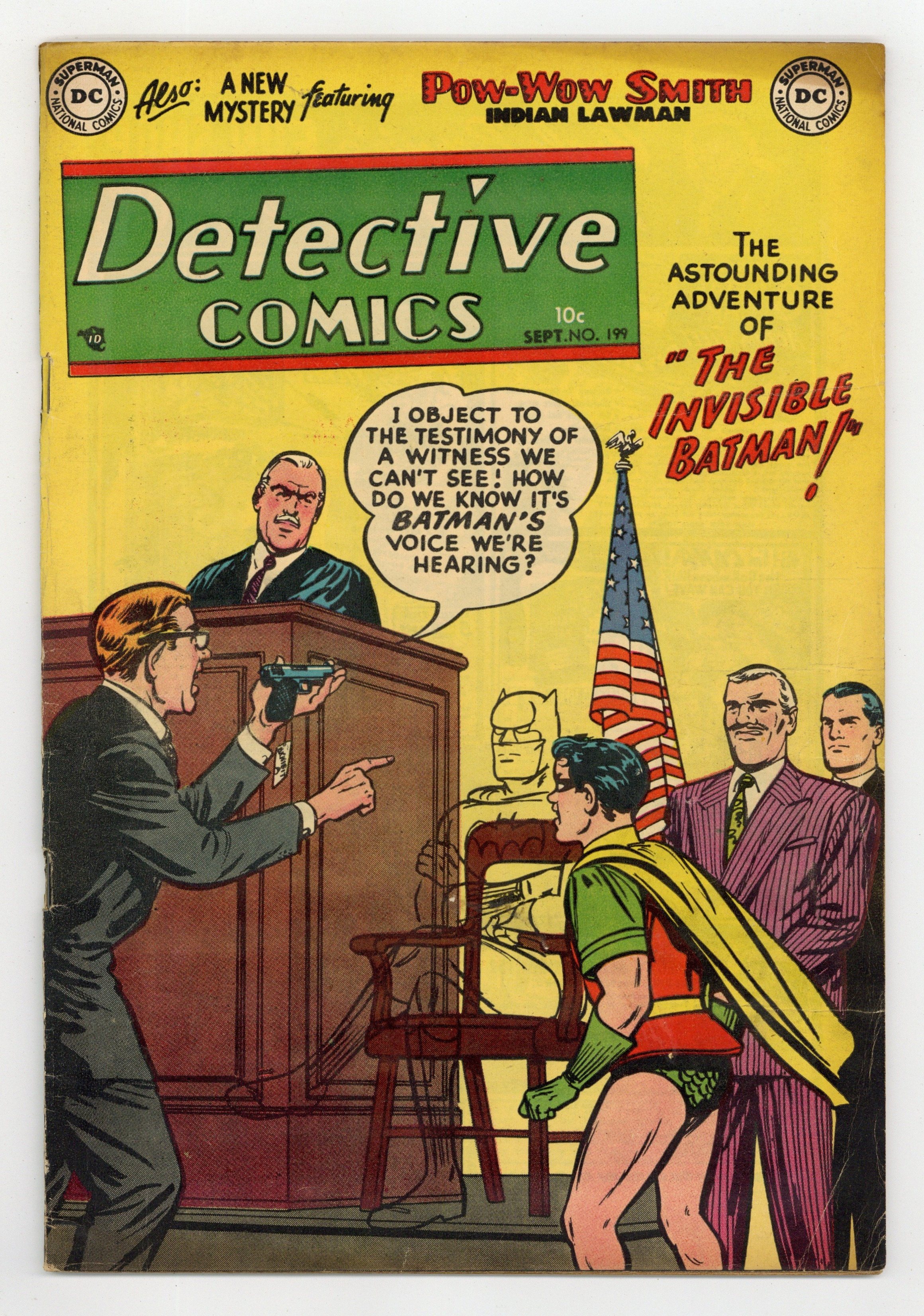 Cover by Win Mortimer. Stories by Bill Woolfolk and unknown. Art by Bob Kane, Lew Sayre Schwartz, Ray Burnley, Stan Kaye, Leonard Starr, Joe Certa and Ruben Moreira. While battling a crime spree in Gotham, Batman is accidentally doused with a radioactive dye, rendering himself invisible. Don't miss Batman and Robin in "The Invisible Batman!" by Bill Woolfolk, Bob Kane, Lew Sayre Schwartz, Ray Burnley and Stan Kaye. Plus: Pow-Wow Smith, Indian Lawman in "The Thunder Warrior of Hollow Mountain!" with art by Leonard Starr; Robotman in "The Robber Robot!" with art by Joe Certa; and Impossible -- But True! tale "The Girl Who Became a Witch!" (featuring Roy Raymond) with art by Ruben Moreira. Also: Varsity Vic half-pager by Henry Boltinoff; Quick Quiz activity half-pager by H.T. Elmo; Casey the Cop 1-pager by Boltinoff; and 2-page text piece "Cracking the Blackmail Bandits" by Jack Miller (as John Marston). 44 pages, full color. Cover price $0.10.