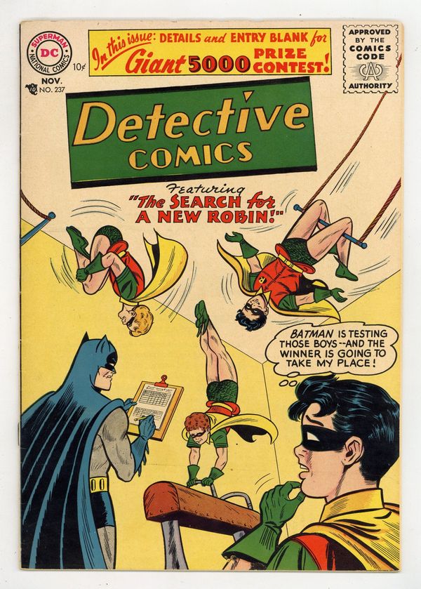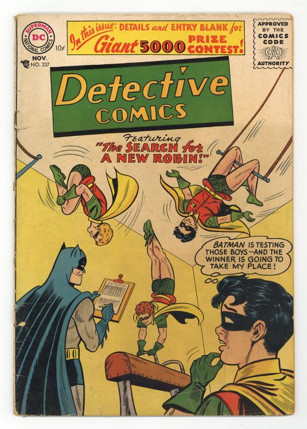 Cover art by Sheldon Moldoff. Search for a New Robin starring Batman and Robin, pencils by Sheldon Moldoff, inks by Charles Paris. Special Election Exhibit public service announcement starring Binky, art by Bob Oksner. Fingers of Flame starring Roy Raymond TV Detective, art by Ruben Moreira. The Sleuth Who Went to Jail starring John Jones Manhunter from Mars, art by Joe Certa. 36 pgs. $0.10. Cover price $0.10.