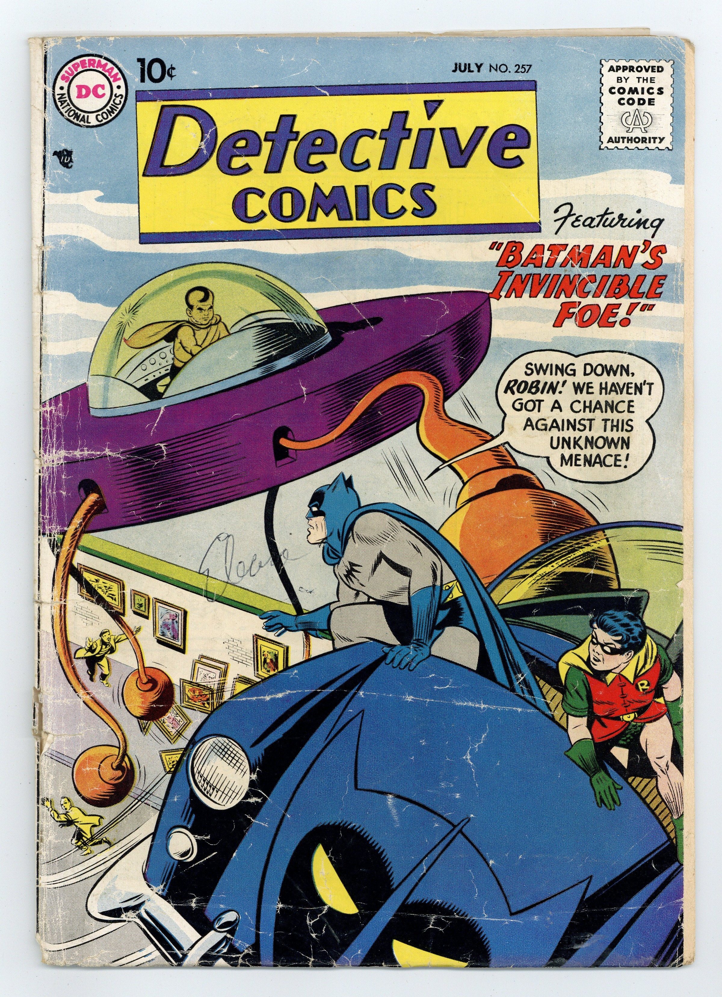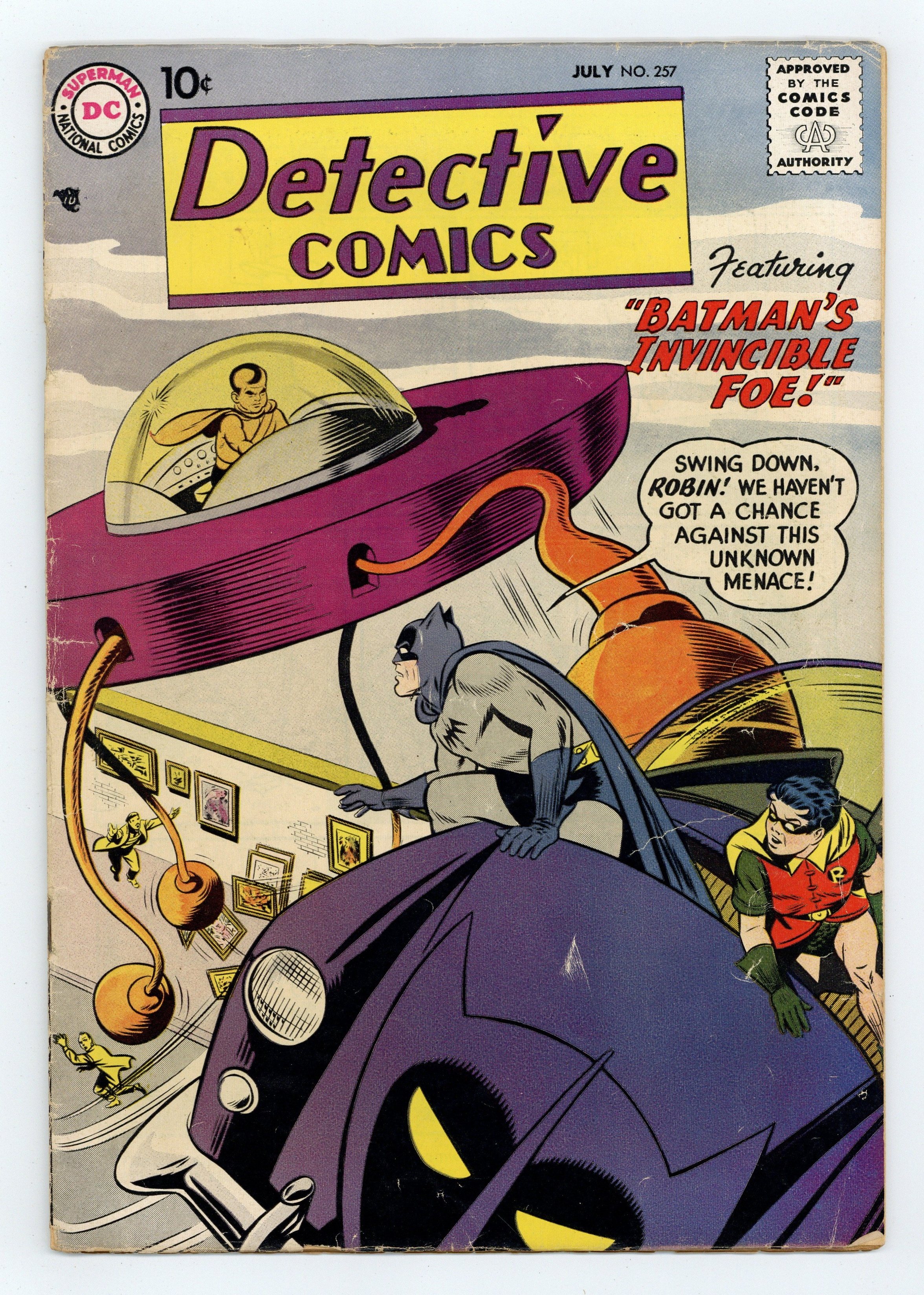 Cover pencils by Curt Swan, inks by Stan Kaye. Are You a Litter-Bug? public service announcement, art by Henry Boltinoff. Intro and 1st appearance of Whirly Bats in "Batman's Invincible Foe" starring Batman and Robin, pencils by Sheldon Moldoff, inks by Charles Paris; A criminal and a policeman from the future draw Batman into the middle of their battle; vs. Karko. Warden Willis two-pager by Henry Boltinoff. "The Return of Cleopatra" starring Roy Raymond TV Detective, art by Ruben Moreira; Roy battles Hamid. Batman Whirly-Word Game activity page. "King of the Underworld!" starring John Jones Manhunter from Mars, art by Joe Certa; There's a gang war to determine who will take Willy Wanger's place, and Jones is determined to win. "O'Malley of the 4th Precinct" one-page story, script and art by Irwin Hasen. 36 pgs., full color. Cover price $0.10.