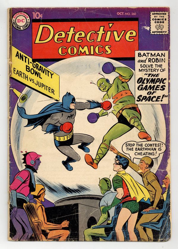 Cover pencils by Curt Swan, inks by Stan Kaye. "The Mystery of the Space Olympics" starring Batman and Robin, pencils by Sheldon Moldoff, inks by Charles Paris; Xeo and Tog from Venus ask Batman and Robin to participate in an interplanetary Olympics, but they are accused of conspiring with the Venusians to cheat. Lost—A Free Education! public service announcement starring Binky, script by Jack Schiff, art by Bob Oksner. "The Fantastic Forest!" starring Roy Raymond TV Detective, art by Ruben Moreira; Roy vs. Finch. The Bullet From Car 1021 article. Jail Jests humor page by Henry Boltinoff. Casey the Cop half-page by Henry Boltinoff. "John Jones' Super-Secret" starring John Jones Manhunter from Mars, art by Joe Certa; Manhunter helps a patrolman regain his confidence. 36 pgs., full color. Cover price $0.10.