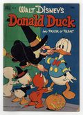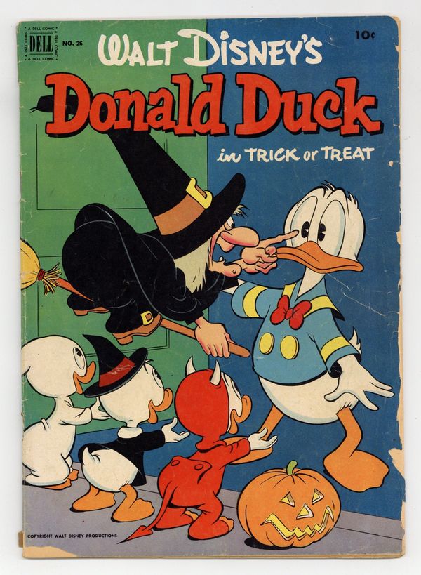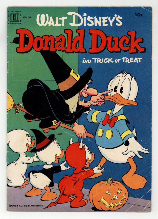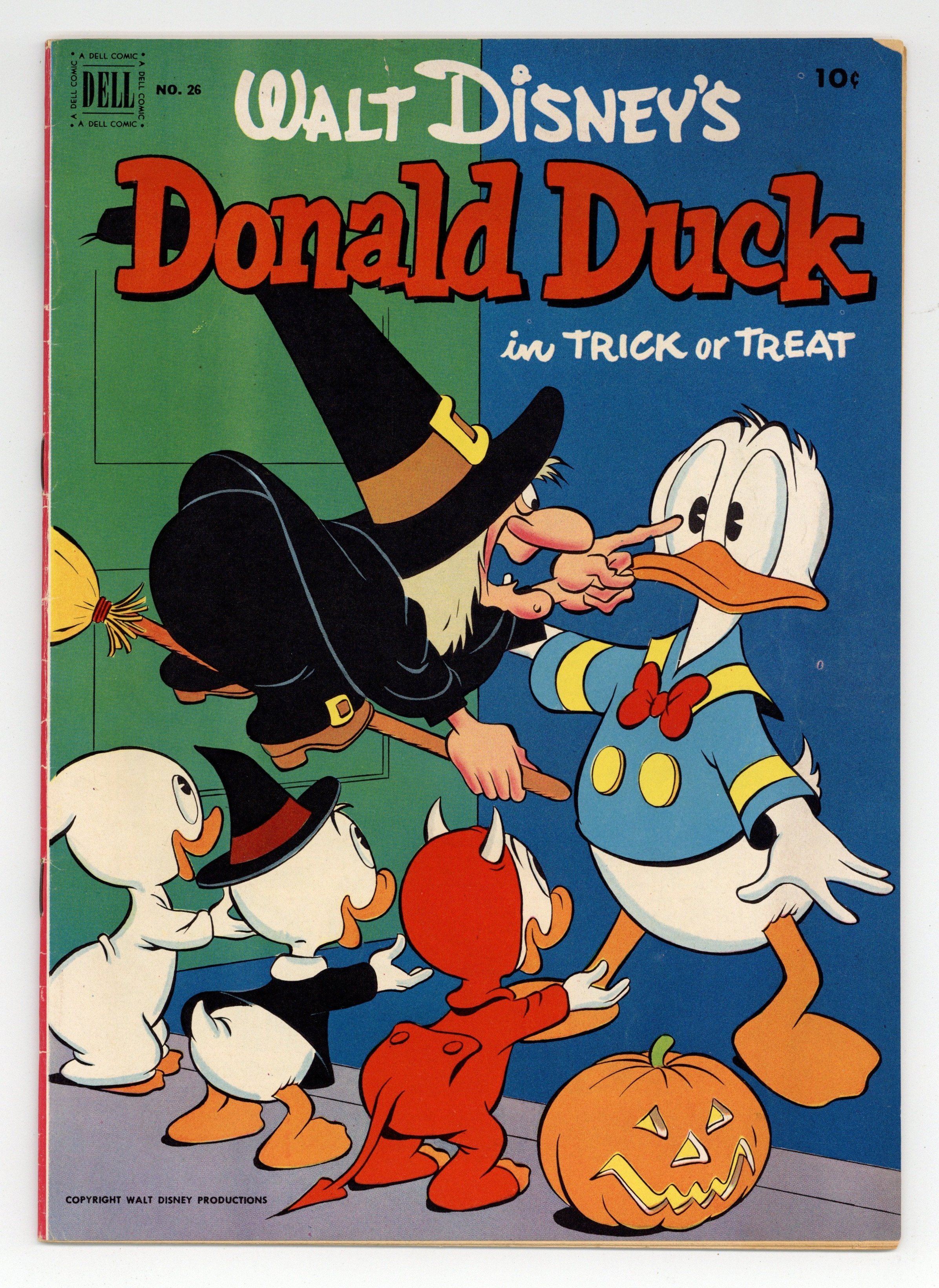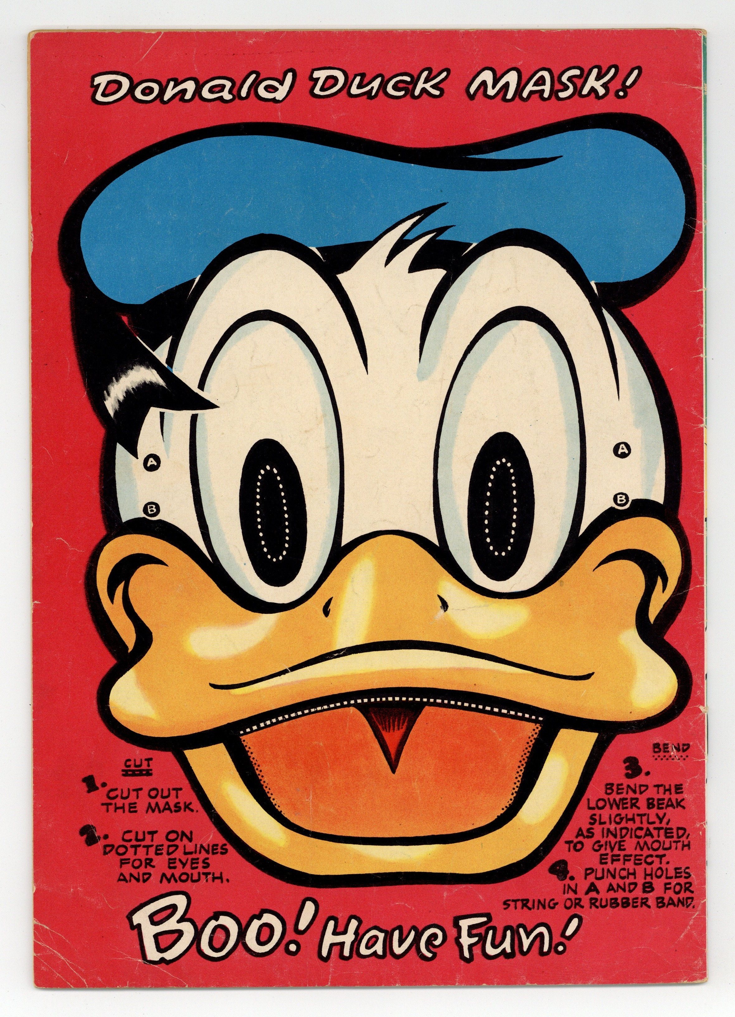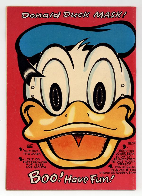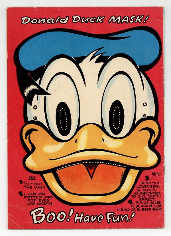 Cover by Carl Barks. Stories and art by Carl Barks. The classic adventures of Disney's Donald Duck, featuring art by Carl Barks and other great Disney artists. The Donald Duck issues of Four Color (1942-1962 Dell 2nd Series) (#147, 159, 178, 189, 199, 203, 223, 238, 256, 263, 275, 282, 291, 300, 308, 318, 328, 339, 348, 356, 367, 379, 394, 408 & 422) are the first 25 issues of this series, in Dell's reckoning. Huey, Dewey and Louie compete with Donald during Halloween trick or treating. This story was based on the classic 1952 Disney cartoon "Trick or Treat." Gyro Gearloose invents a "goblin foiler" for Huey, Dewey and Louie. Donald tries to scare Daisy with a Halloween mask. The back cover is a Donald Duck mask for kids to cut out and wear. Trick of Treat; Hobblin Goblins. 32 pages, Full Color. Cover price $0.10.