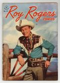 $27.50Photo cover of Roy Rogers. Roy and Dale Evans, rearing on original Trigger, inside front cover photo. Roy Rogers and the Dead Men's Gold, script by Gaylord Du Bois, art by Albert Micale; Roy gets the goods on a crooked lawyer. Roy and original Trigger, with Roy leaning on a hitching rack, inside back cover photo. Roy behind wagon wheel, six-shooter drawn, back cover photo. 52 pages, full color. Cover price $0.10.