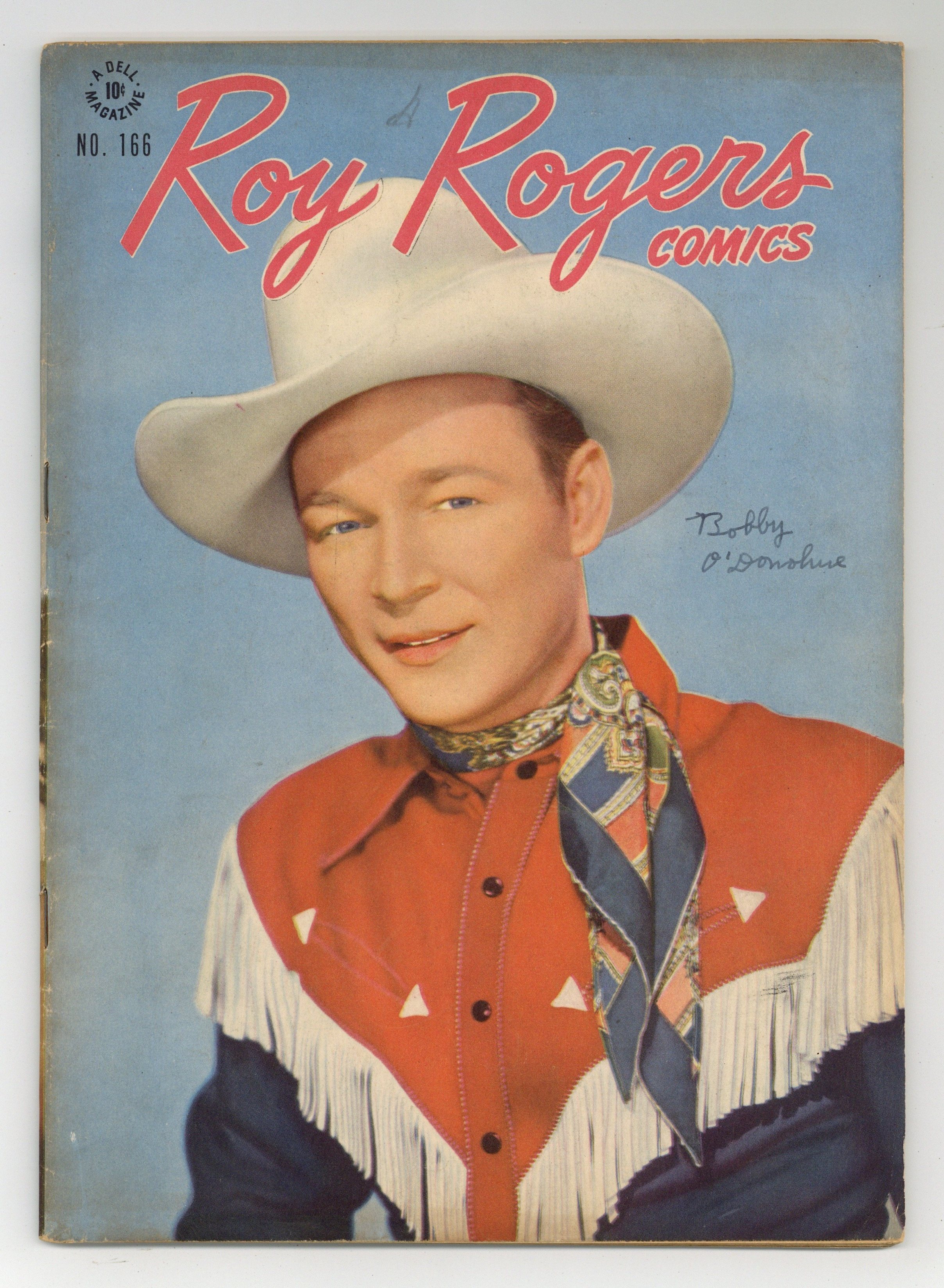 $21.00Indicia title is "ROY ROGERS COMICS, No. 166." Roy Rogers photo cover. The Basin Ranch Mystery, script by Gaylord Du Bois, art by Albert Micale; Roy comes to Belmore to search for the murderer of the son of a good friend, Pa Pendleton; On his way to the Basin Ranch, he finds Pa Pendleton, killed in the same manner as his son, with many knife slashes but no sign of his attackers. Roy Rogers inside back cover photo. Roy, Cheryl, and Linda Lou Rogers back cover photo. 52 pages, full color. Cover price $0.10.