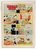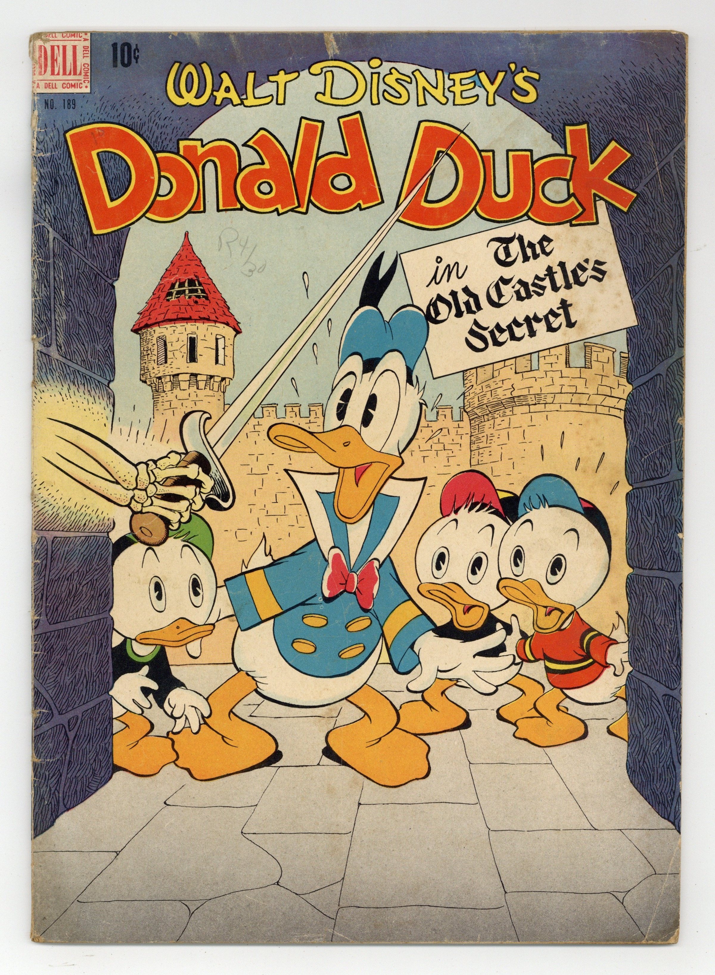 Indicia title is "Walt Disney's DONALD DUCK IN THE OLD CASTLE'S SECRET, No. 189." Cover art by Carl Barks. The Old Castle's Secret, script and art by Carl Barks; Uncle Scrooge and the ducks go to Scotland to find the treasure hidden in the walls of the old McDuck castle, and there they encounter a "ghost" that is invisible except for the shadow cast by its skeleton; The "ghost" soon steals the treasure and traps the ducks on a balcony a hundred feet above the ground, but the nephews get down safely and find a secret entrance to the castle through an old graveyard. Horseshoe Luck, script and art by Carl Barks; Donald refuses to believe that finding a horseshoe brings good luck. Bean Taken back cover strip by Carl Barks; Donald devises a system for guessing the number of beans in a jar. 36 pages, full color. Cover price $0.10.