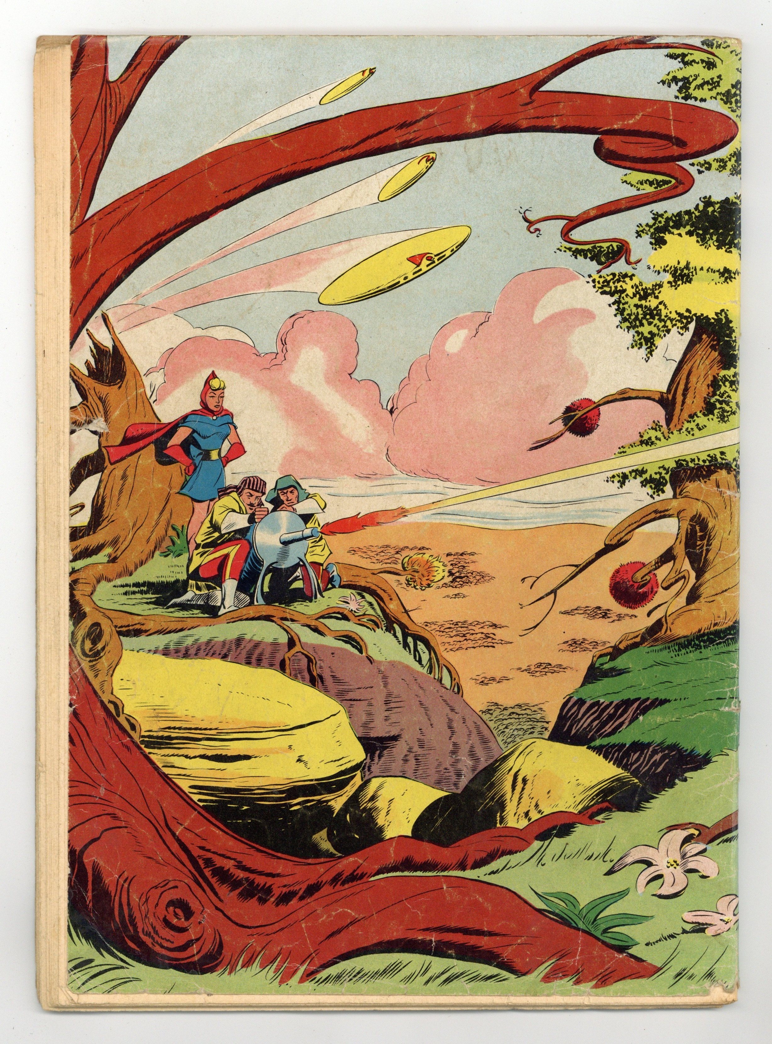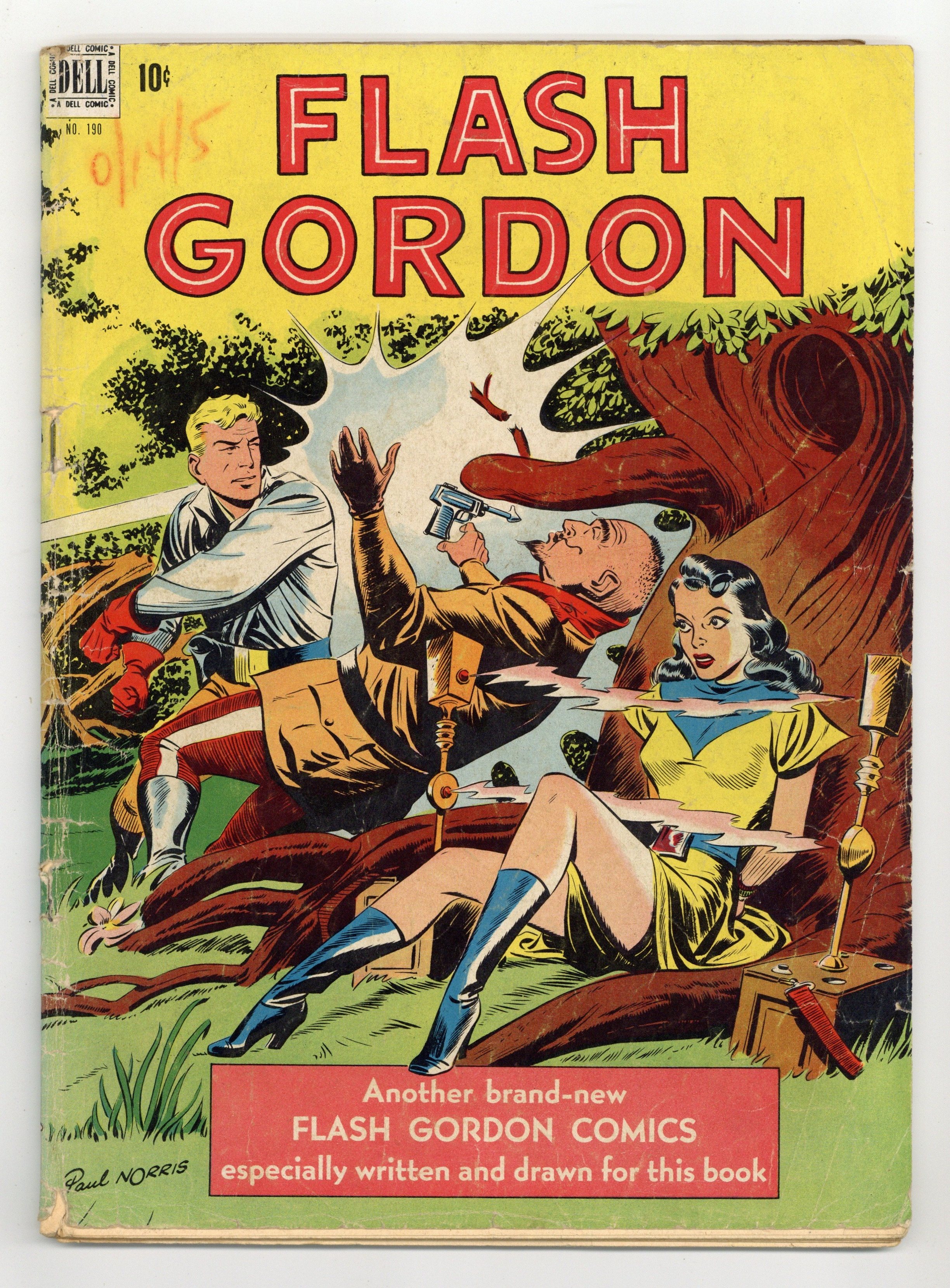 Indicia title is "FLASH GORDON, No. 190." Cover art by Paul Norris. Activity page with drawings of Flash Gordon's rocket ship, to be pasted on cardboard and cut out and assembled. The Adventure of the Flying Saucers, script and art by Paul Norris; While on Mongo, Flash and Dale spot flying "disc-ships" traveling from the planet Misto to attack Earth; They follow the ships to Earth, where Flash destroys the fleet, except for the ship of the commander, Wongee; who disables Flash's ship. Flash attaches his ship to Wongee's and after a mutiny against Wongee, Flash and Dale are taken to Misto; They escape from the ship as it comes in for a landing and find themselves in the midst of a rural area. Misto Disc Ship activity page; Drawings of the top and bottom of a Misto Space Ship, designed to be pasted to cardboard and cut out and glued back to back to make a flying disc. 52 pages, full color. Cover price $0.10.