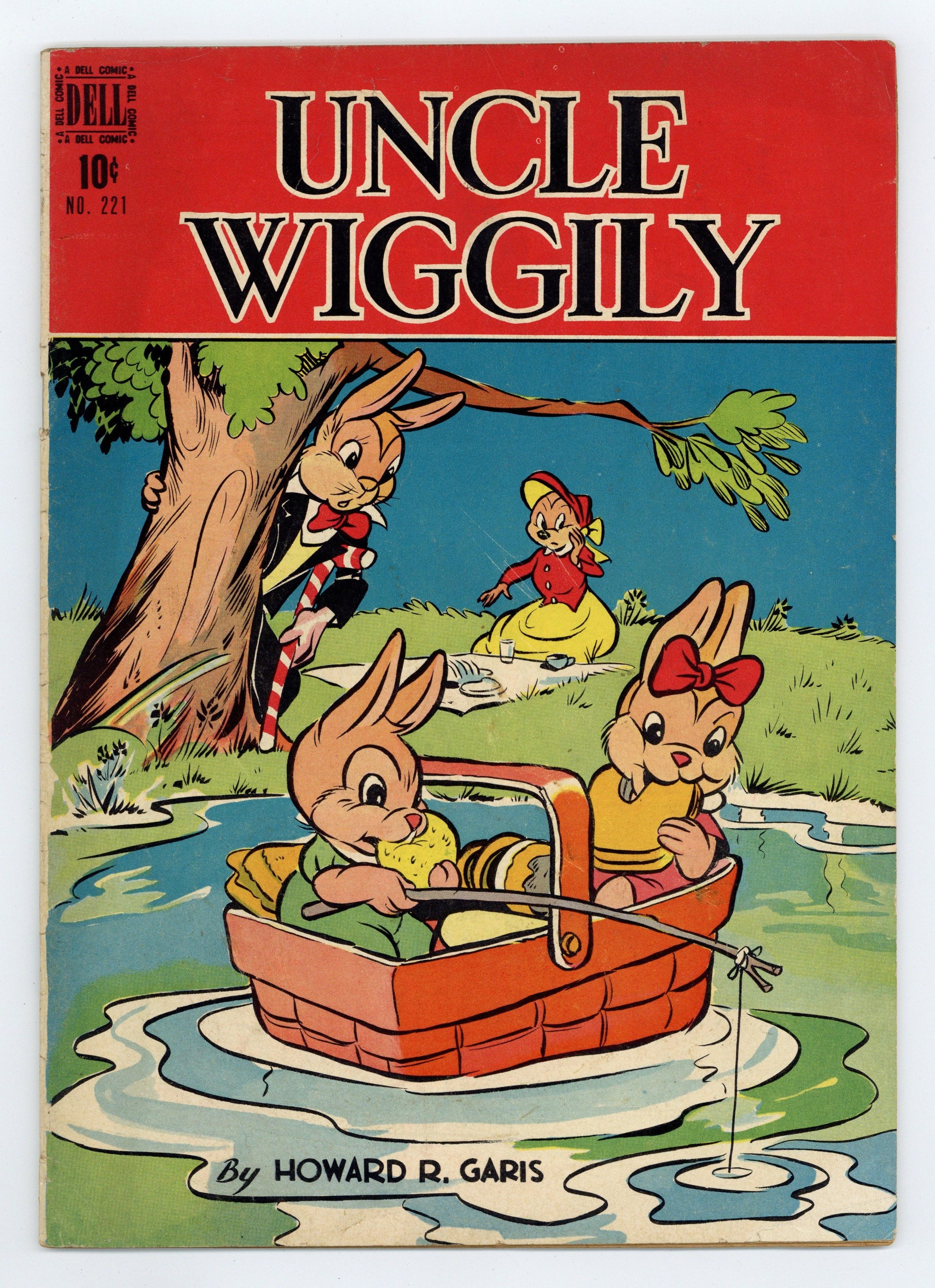 Indicia title is "UNCLE WIGGLY, No. 221." Untitled Uncle Wiggily stories, scripts by Roger Garis, art by Francis Kirn; Uncle Wiggily is trapped by the Bad Chaps on his way home from buying a new dishpan for Nurse Jane. Wiggily sets up a decoy target for the Bad Chaps to throw snowballs at while he goes for the police. Wiggily practices acrobatics to defeat the Pipsesewah and the Skeezicks. Uncle Wiggily tries to help his dog friend Sport, who's depressed because his tail is too short. Butch Bear tries to steal Bunty's candy, but gets his nose stuck to the pan. Shaggy Wolf steals one of Nurse Jane's dresses to make a trap to catch Uncle Wiggly. Uncle Wiggily and Uncle Butter have a sled race. Reprinted from Uncle Wiggily (Bell Syndicate) Sunday newspaper strip from 1947 and 1948. 36 pages, full color. Cover price $0.10.