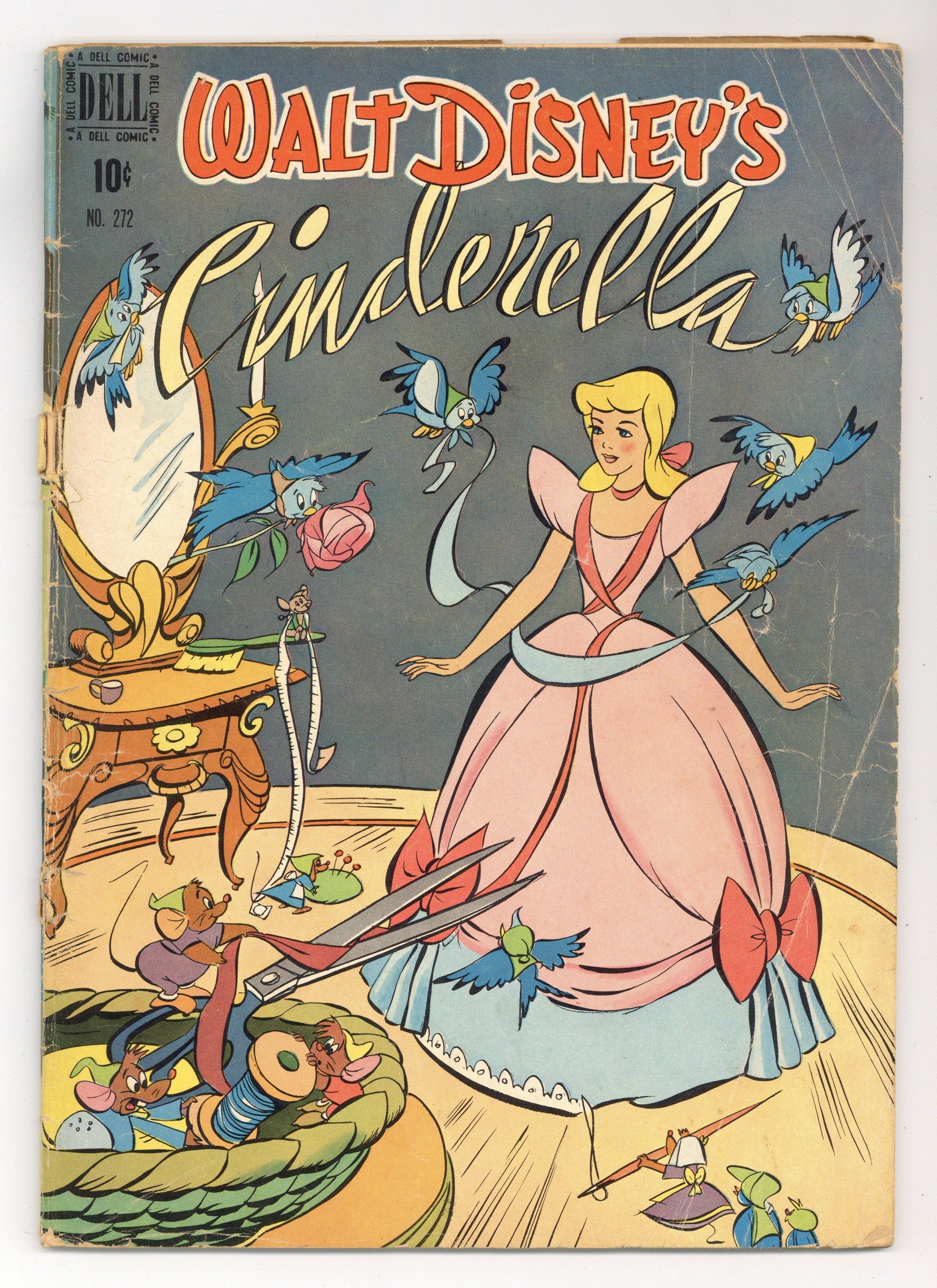 Indicia title is "Walt Disney's CINDERELLA, No. 272." Cover art by Dan Gormley. Inside front cover and inside back cover; Ten stills from the movie, printed in monochrome bluish-black ink, with a line of text underneath. Cinderella, script by Chase Craig, art by Dan Gormley; Cinderella, after being tormented by her evil stepmother and step-sisters, gets to go to the Prince's ball with the help of her Fairy Godmother; Adapted from the 1950 Disney animated movie "Cinderella." 52 pages, full color. Cover price $0.10.