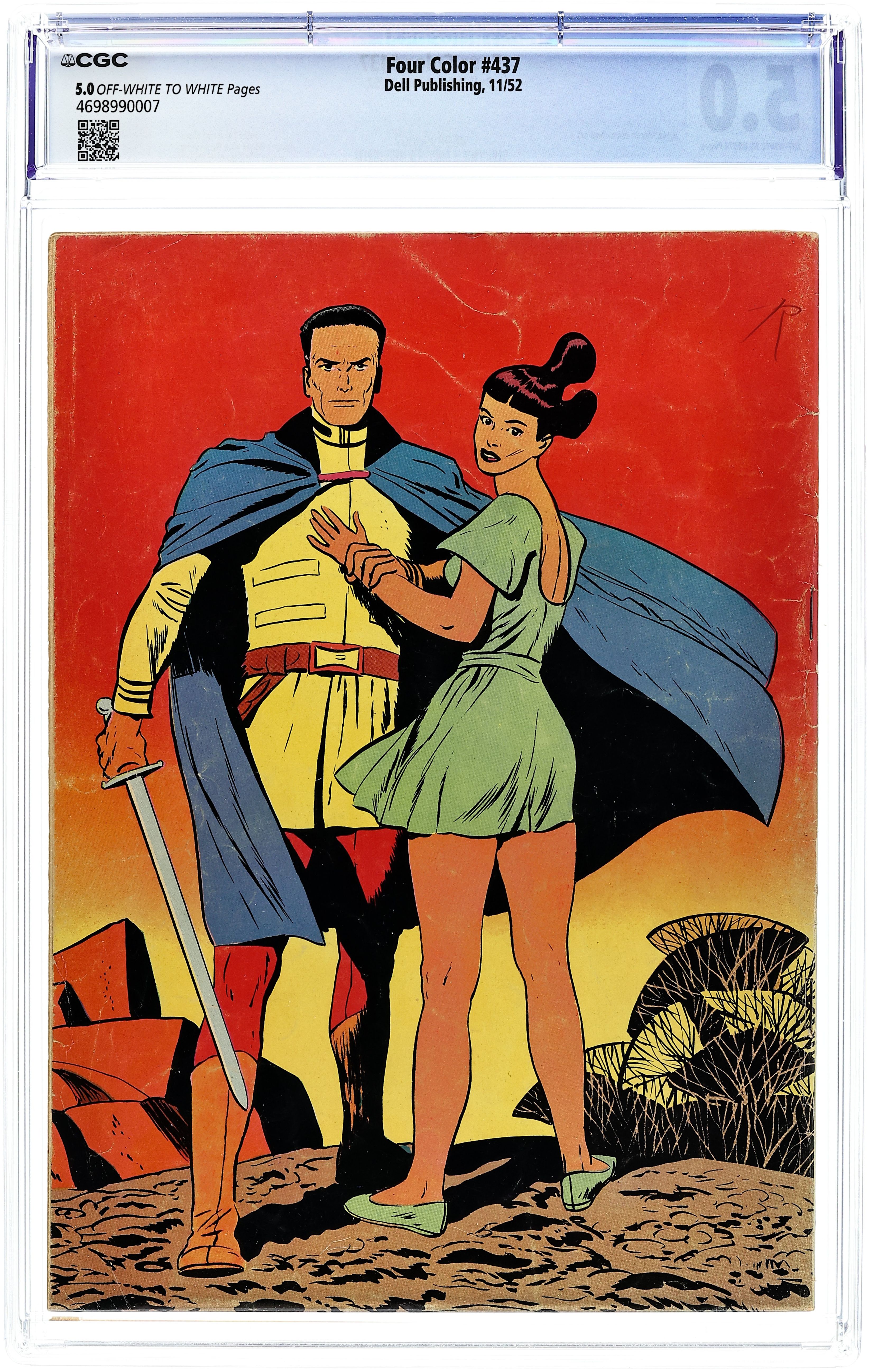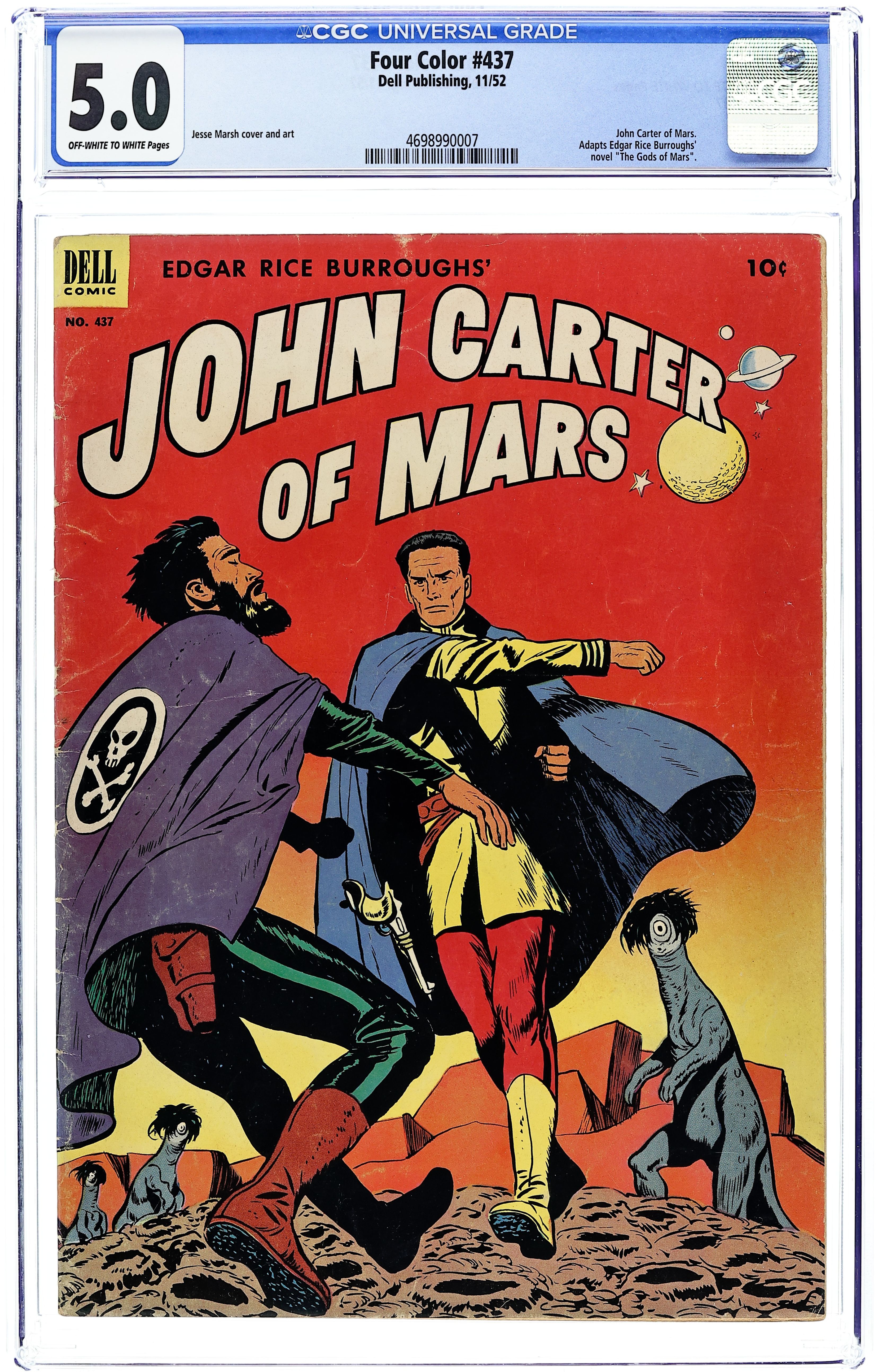 Indicia title is "Edgar Rice Burroughs' JOHN CARTER OF MARS, No. 437." Cover art by Jesse Marsh. The Black Pirates of Omean, art by Jesse Marsh; After ten years away from Mars, John Carter is finally able to return and finds himself in the Valley Dor, where every Martian comes at the end of life; When savage plant men attack three Tharks. John is able to save one, who coincidently is an old friend, Tars Tarkas; John and Tars escape the plant men through a passage that leads them into the city of the Therns; There they rescue a slave girl, Thuvia, and learn the Therns are being raided by the Black Pirates of Omean, who have captured Dejah Thoris, John's wife on Barsoom; John takes over a pirate cruiser where Phaidor, the princess of Thern is held; After John defeats the pirate captain Xodar, the three go to the Temple of Issus deep under the South Pole of Mars. Illustration of John Carter and Dejah Thoris on back cover by Marsh. 36 pages, full color. Cover price $0.10.