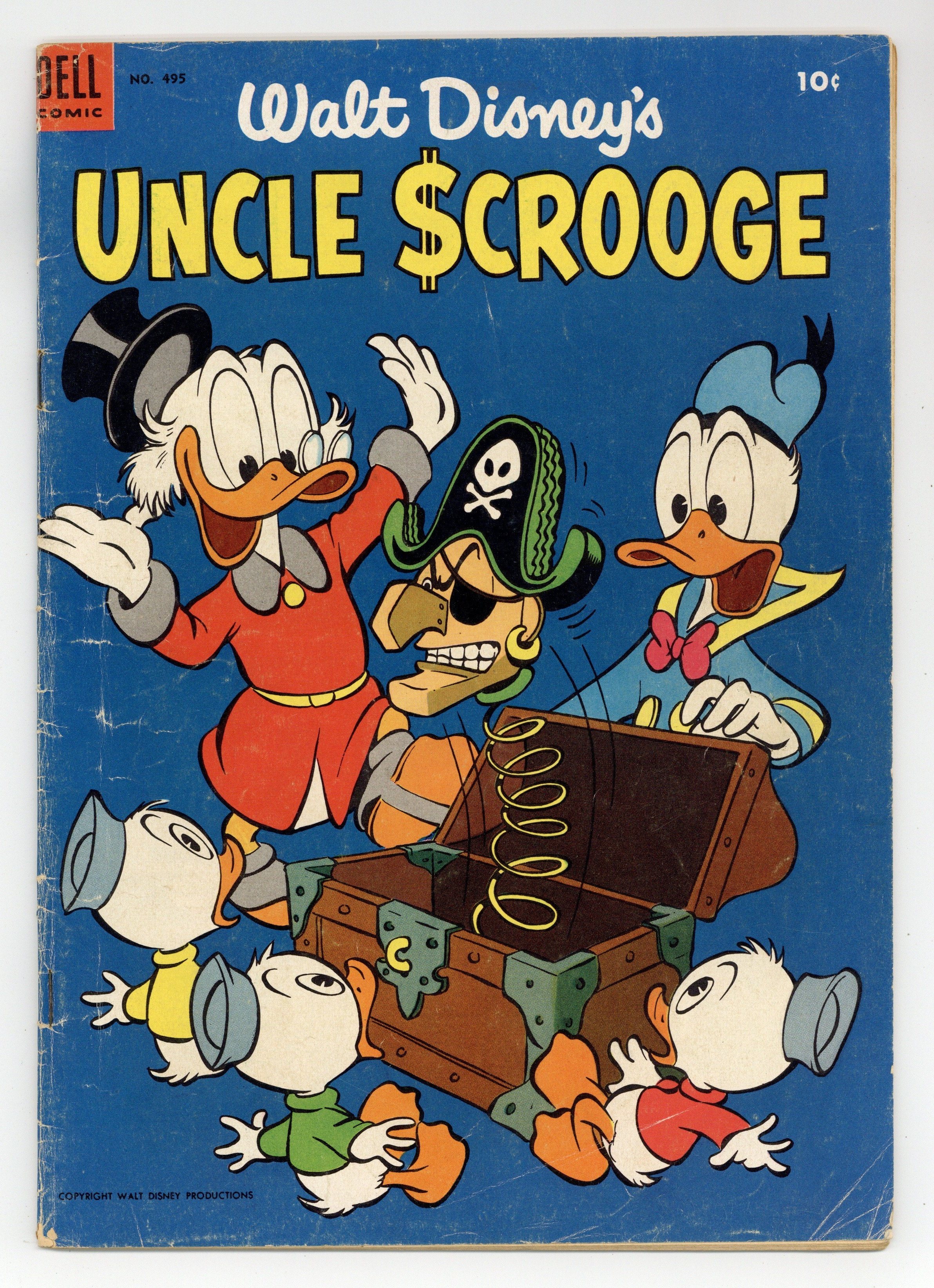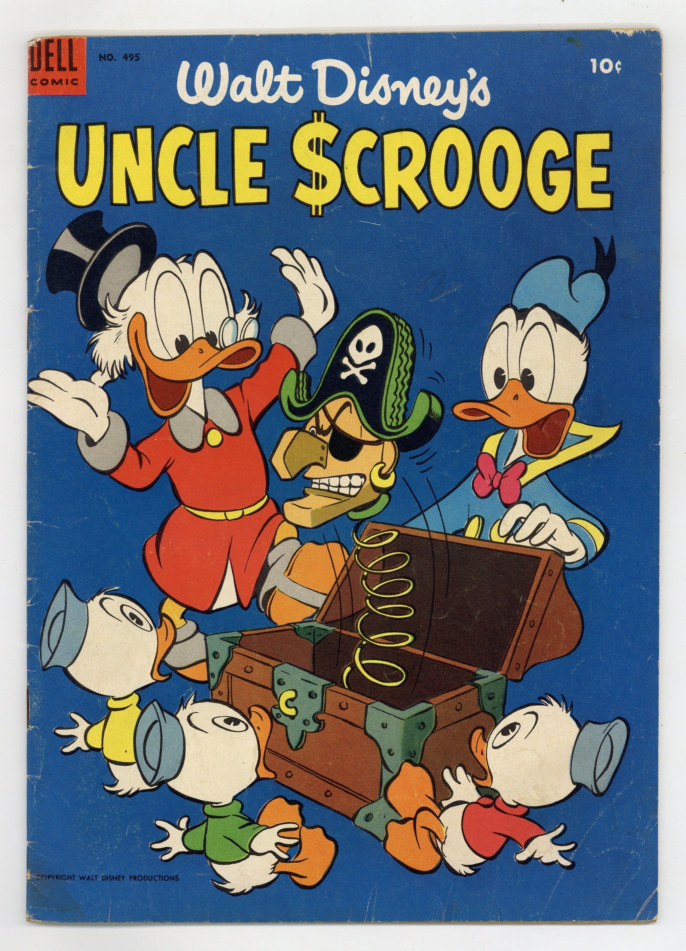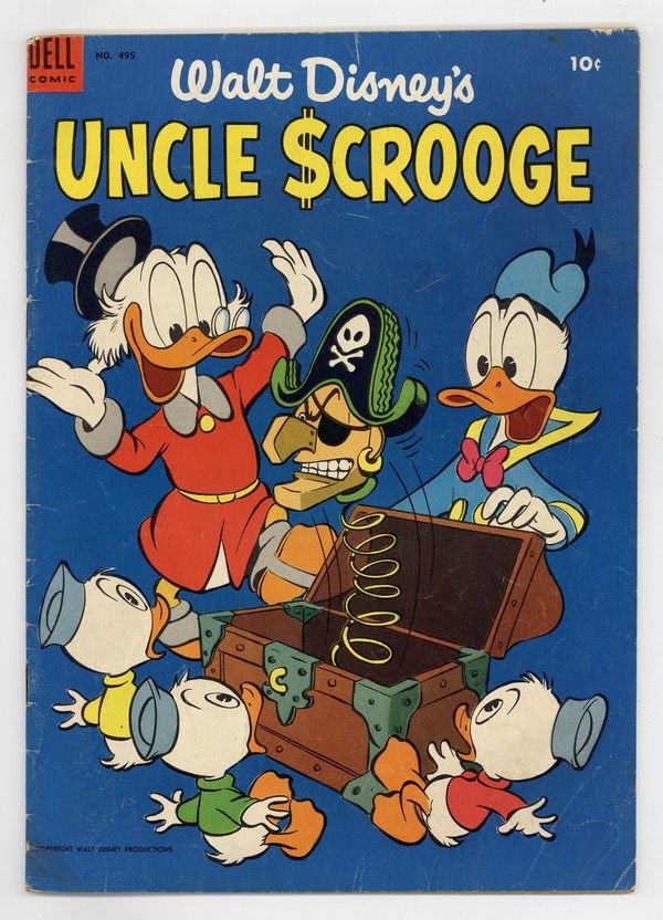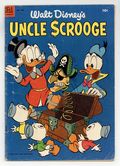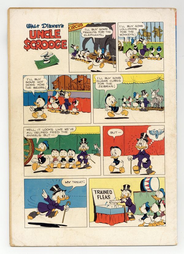 Cover art by Carl Barks. Horseradish Treasure; Scrooge is faced with the loss of his entire fortune to Chisel McSue because, many years before, an ancestor of Scrooge's failed to deliver a case of horseradish to Jamaica, and then failed to give all his property to McSue's ancestor, as provided in a contract; Scrooge can save his fortune only by fulfilling the terms of the original contract, and the ducks set out in a small sailing ship to find the horseradish, which was on a ship that sank in the Caribbean. The Round Money Bin; For safety's sake, Scrooge has his coins changed into greenbacks and stores them in an old water tank, but this fails to stop the Beagle Boys. 36 pages, full color. Cover price $0.10.
