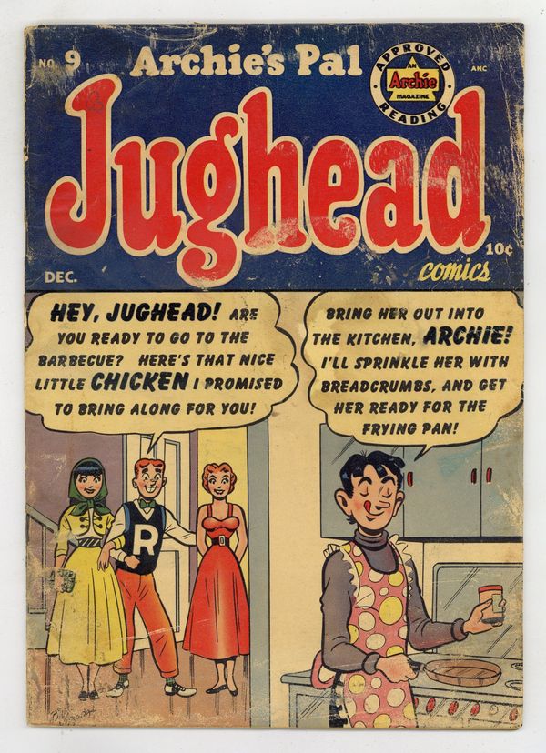 Cover by Bill Vigoda. "Inside Dope"; Jughead and Archie show Mr. Weatherbee how to put a vase of water upside down on one's head. "Taste of the Town"; Jughead is excited about eating at Veronica's because of the cook Gaston; When he finds out that Gaston is gone he knows that Veronica and Betty will cook, so he numbs his tongue before the meal. "Tonsil Tonic"; Jughead confuses everyone by not speaking because he has tonsillitis; They buy him ice cream to soothe his throat after the tonsillectomy. "Glue or Die"; Archie and Reggie are competing to see who can score the most points in the football game, to get a date with Veronica. "Sky High"; Jughead doesn't want to pay five dollars for a plane ride, so the pilot agrees that it will be free if they can stay silent throughout the flight. "Essay It Isn't So"; Jughead won an essay contest with his essay about neatness and personal appearance. 36 pgs., full color. Cover price $0.10.
