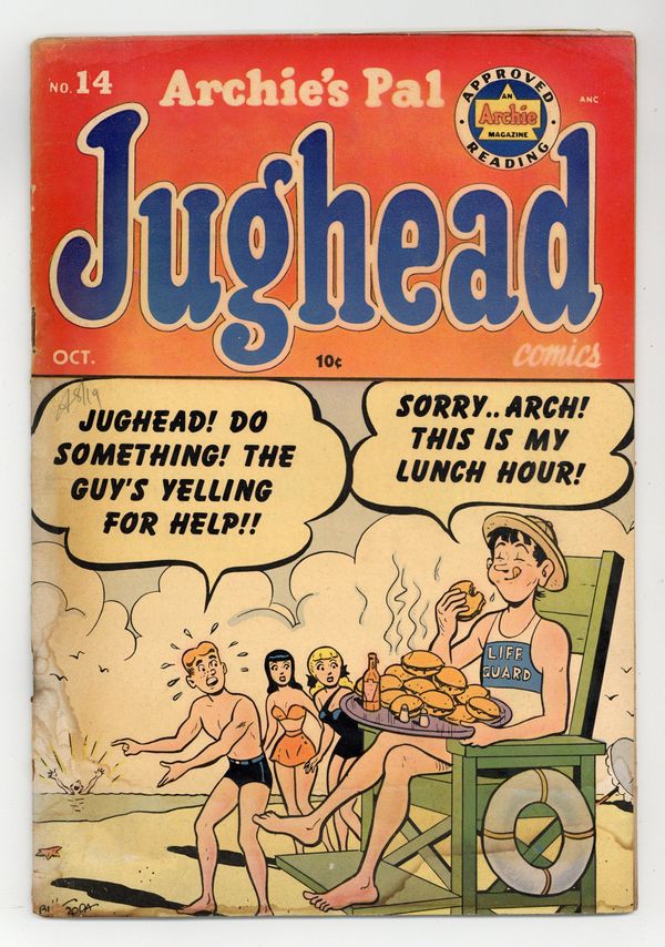 Cover art by Bill Vigoda. "We Want A Re-Count"; Jughead wins every category in the school favorites because he voted for himself enough to win a majority. "Labor Of Love"; Pop Tate hires Jughead to be a soda jerk, but Jughead doesn't make a very good worker. "Leaf Me Alone"; Mr. Weatherbee offers a day off of school for the student who will rake the leaves; Jughead piles the leaves and starts to burn them; The smoke goes straight into Mr. Weatherbee's office. "Spellbound"; Reggie pronounces the word "xenodochein" and asks Archie to spell it backwards, so Archie spells "it" backwards. "Party Line"; Jughead's father encourages him to be more social since it's his birthday; He overhears his friends planning his surprise party; He invites everyone to the Chok'lit Shoppe that night. 36 pgs., full color. Cover price $0.10.