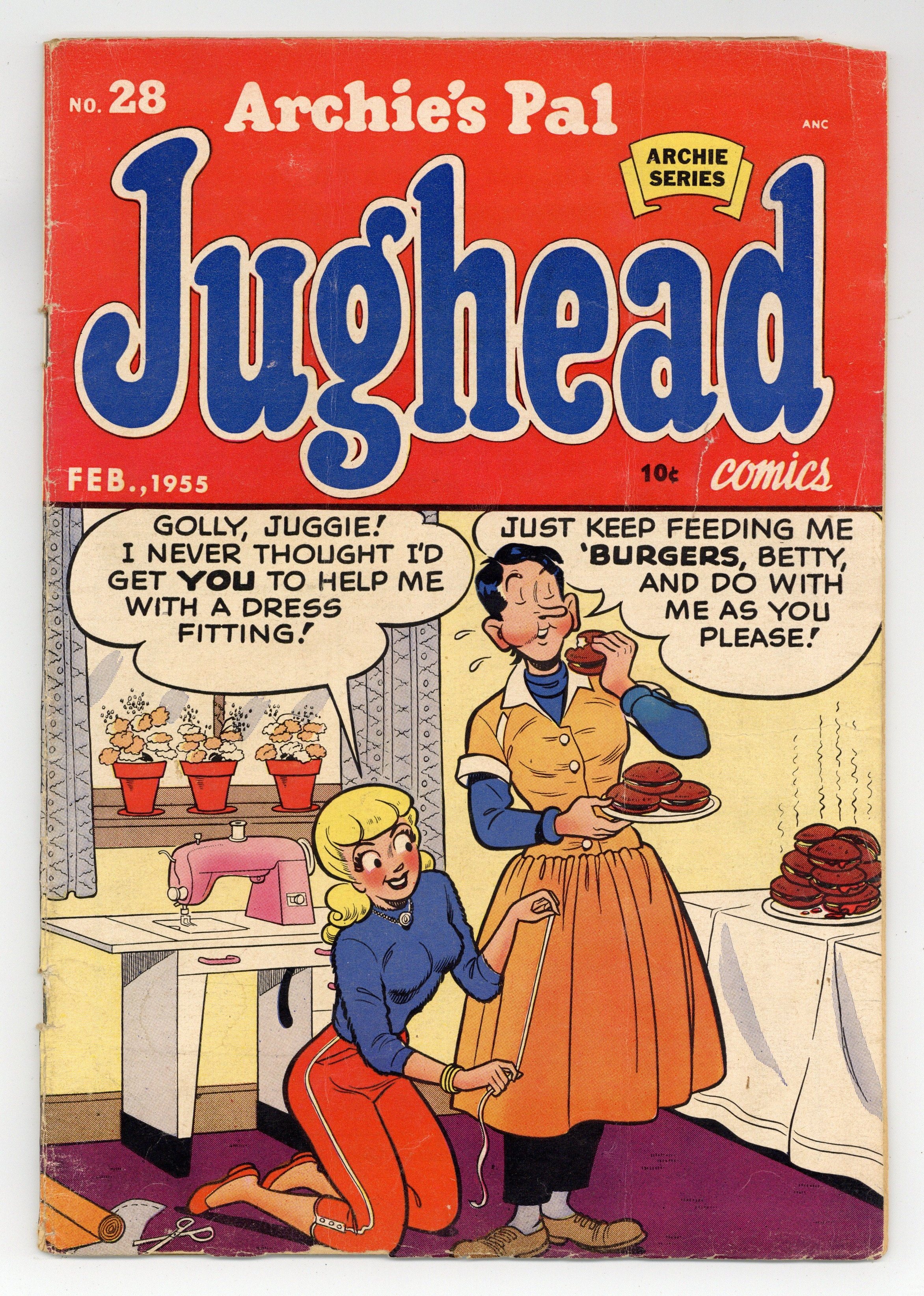 Worry Wart; Jughead charges Archie and Reggie to keep them out of detention; His plan to cover their books using paint backfires when Mr. Weatherbee grabs the still-wet books and gives Archie and Reggie a month of detention. Book Shnook; Reggie makes fun of Jughead working in a book shop, but he finds something interesting in one of the books, what appears to be a personal note from William Shakespeare to Marc Antony, the subject of the play. Two Pages from Debby's Diary; Debby helps her mother clean the attic and discovers her mother's old diary. "Balance of Power"; Reggie thinks he's fooled Jughead by out-balancing him using a Thermos bottle to balance on his head and only dropping it three times. "If the Shoe Fits"; Reggie is the judge at a Cinderella dance, where the girl whose foot fits his shoe will win a dArchie wants to buy perfume for his girlfriend, but when the salesman learns Archie has only two dollars, he kicks him out of the store.ate of her choice at the nicest restaurant in town. "There Are Smells That Make Us Happy"; 36 pgs., full color. Cover price $0.10.