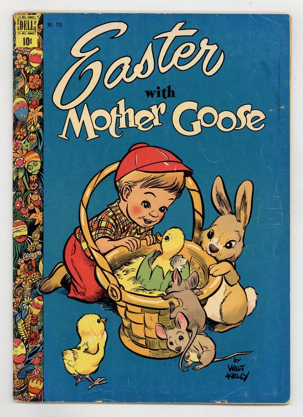 $22.00Indicia title is EASTER with MOTHER GOOSE, No. 220. Cover art by Walt Kelly. Jack Rabbit and the Beanstalk; The story of Jack and the Beanstalk in funny animal form; Jack is a rabbit and the giant is a tiger. Humpty Dumpty's Song; Humpty Dumpty's song from "Alice Through the Looking Glass" by Lewis Carroll. Mother Hubbard's Cupboard; The Easter Bunny brings some eggs to fill Mother Hubbard's empty cupboard. The Wise Men of Gotham; Three "wise" men make nonsensical arguments. Hickory and Dickory Help the Easter Bunny; A pair of mice, Hickory and Dickory, help the Easter Bunny finish delivering his Easter baskets. Scripts and art by Walt Kelly. 52 pages, full color. Cover price $0.10.