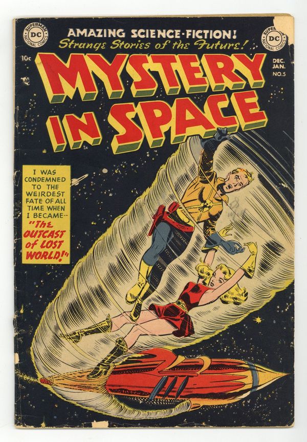 Knights of the Galaxy star in "Outcast of Lost World" (script by Robert Kanigher as "Dion Anthony," pencils by Carmine Infantino?); "Kidnapped in Space!" (script by Gardner Fox); "The Pool of Time!" (script by Jerry Coleman); and "The Secret Story of Ray-Gun 64!" (script by "John Osgood"). One-page Tootsie Roll ad, "Captain Tootsie Bags Mountain Lion" by Bill Schreiber. 44 Pages, Full Color. Cover price $0.10.