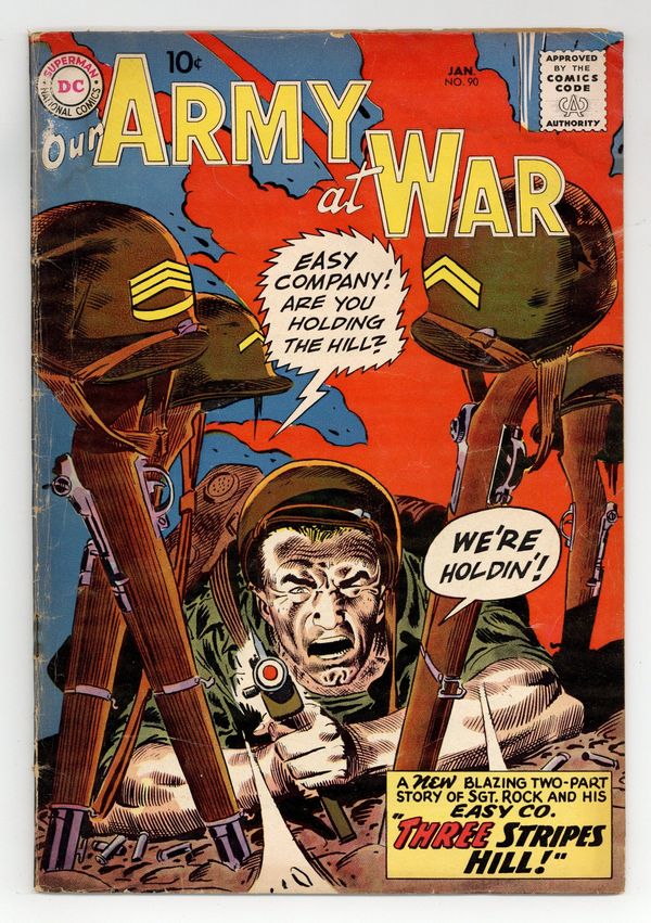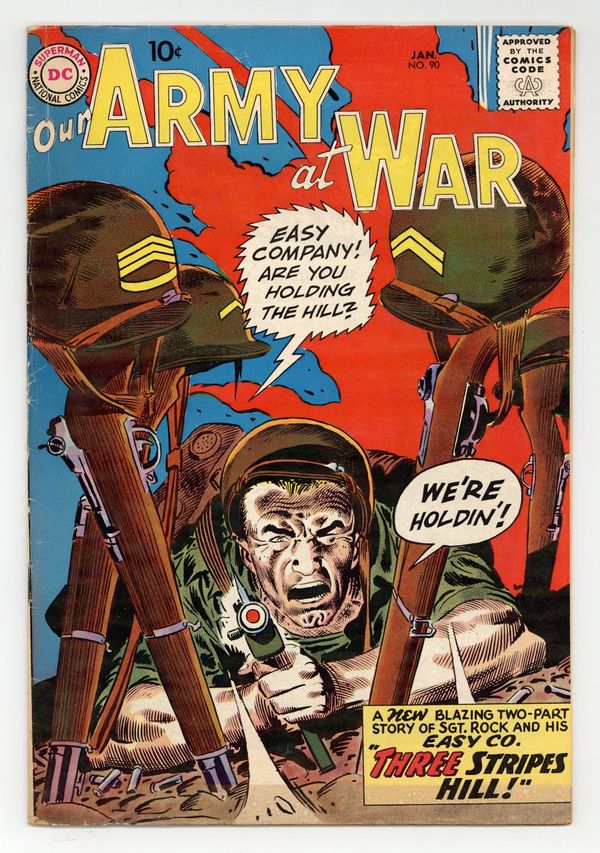 Cover art by Joe Kubert. 3 Stripes Hill! starring Sgt. Rock, script by Bob Kanigher, art by Joe Kubert. A Jet Called Ace, script by Hank Chapman, art by Jerry Grandenetti. Rearguard, script by Bob Haney, pencils by Bob Forgione, inks by Jack Abel. 36 Pages, Full Color. Cover price $0.10.