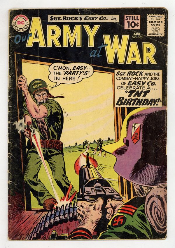 $59.00Cover art by Jerry Grandenetti. TNT Birthday starring Sgt Rock, script by Bob Kanigher, art by Joe Kubert. No Home For A Frogman, script by Bob Haney, art by Jack Abel. Double Bait, script by Bob Haney, art by Jack Abel. 36 Pages, Full Color. Cover price $0.10.