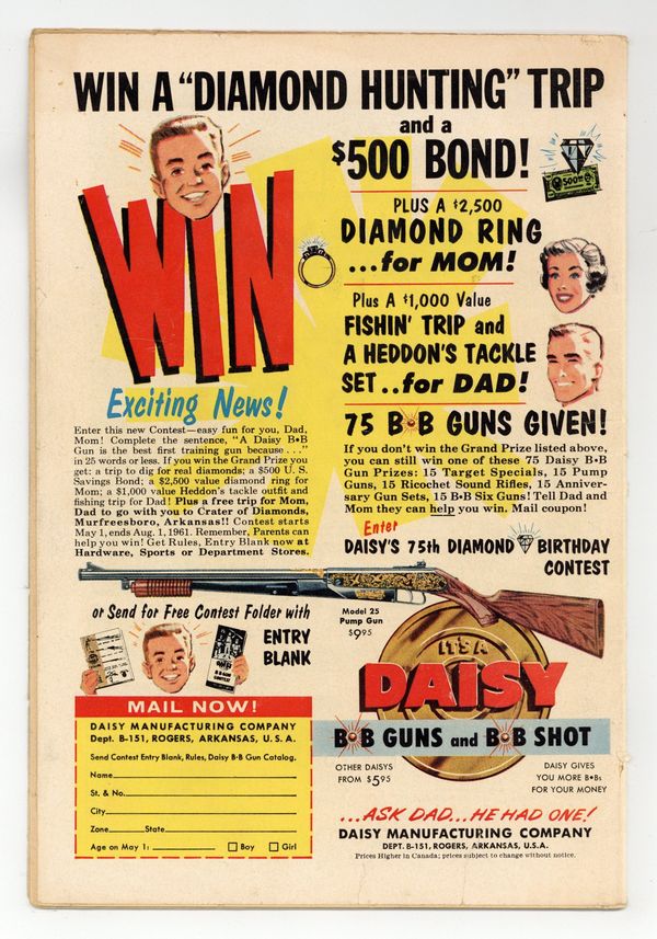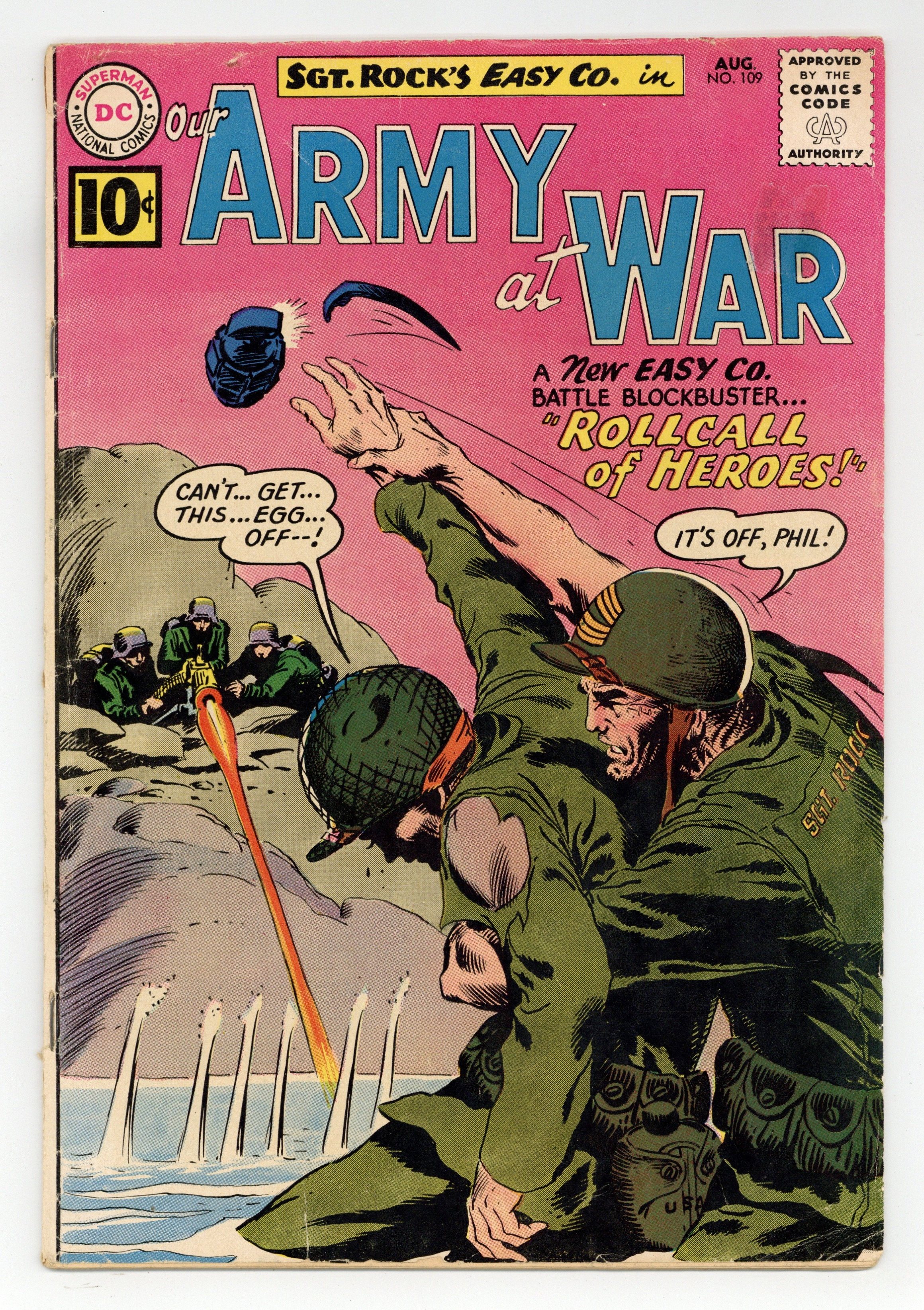 Cover art by Joe Kubert. Roll Call of Heroes starring Sgt Rock, script by Bob Kanigher, art by Joe Kubert. Drop One For Me, script by Bob Haney, art by Jack Abel. 36 Pages, Full Color. Cover price $0.10.