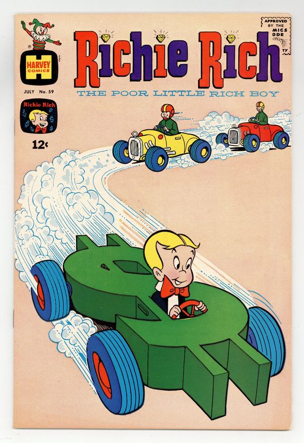 Tags: Richie Rich$15.50Harvey's flagship title featuring the adventures of Richie Rich, the richest kid in the world. Richie invites Gloria's Aunt Mingle to a Rich estate garden party, and learns why she's the "life of the party." Lotta and Dot have an argument that puts them on the outs with each other, until they hear some boys insulting them. Little Lotta learns her uncle Tim's motel is struggling for business, then she accidentally creates an attraction while exploring a nearby cave. Highest Society; The Dollar-Mation Dog; Little Dot: The End of a Beautiful Relationship; Follow the Leader; Going Home; Little Lotta: The Abominable Throw Man. 32 pages, Full Color. Cover price $0.12.