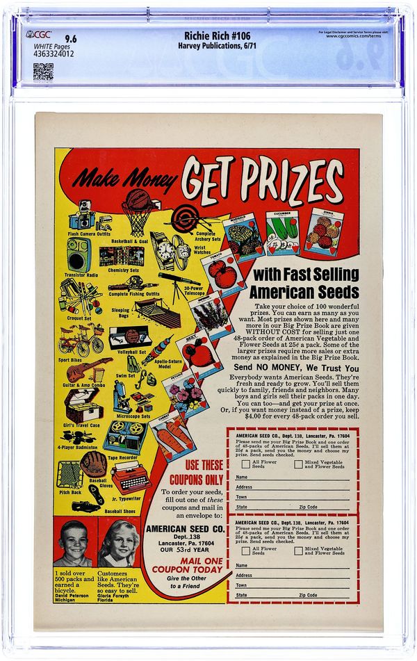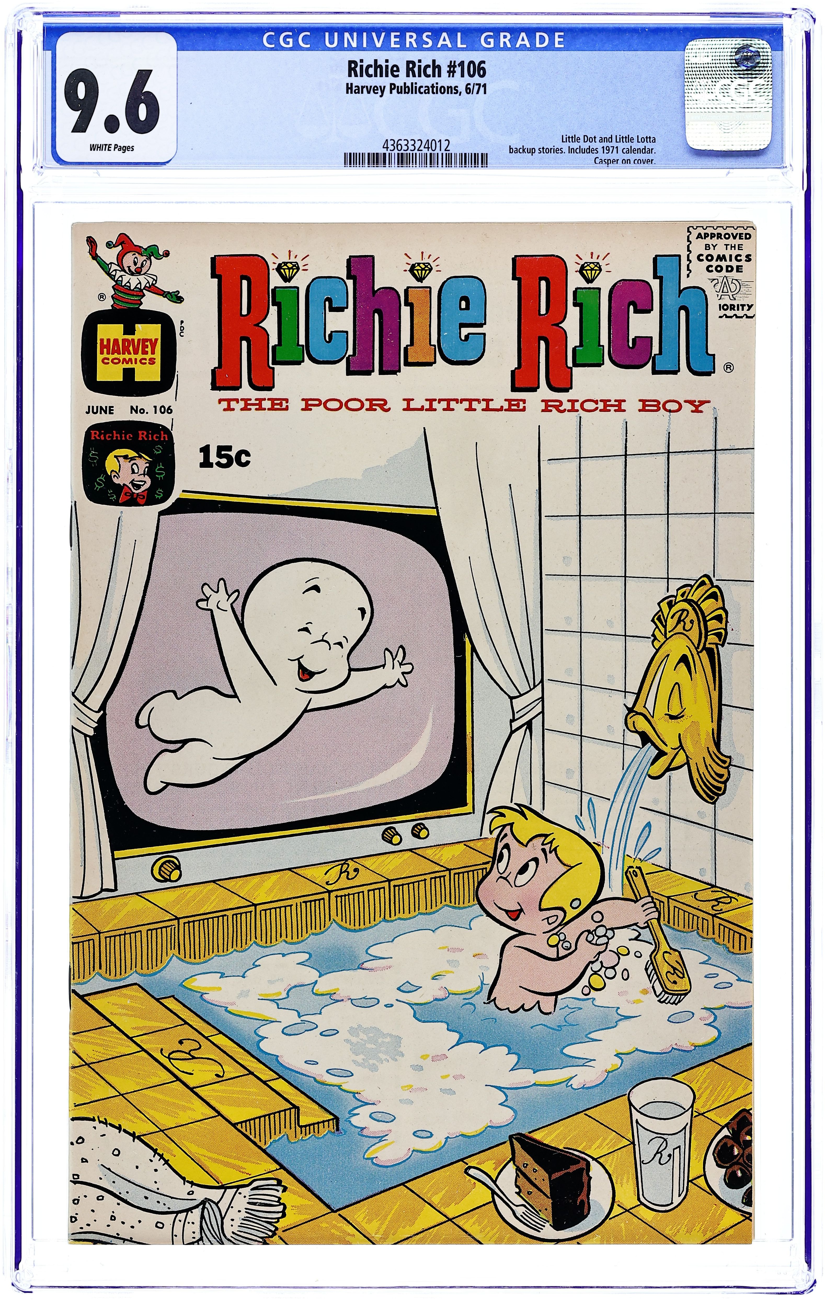 Harvey's flagship title featuring the adventures of Richie Rich, the richest kid in the world. Richie's estate is so high-tech, even the ants at the picnic are robotic - and sentient. Gloria tries to protect Richie from danger, only to learn it's actually Richie's robot duplicate. Richie competes with his mean cousin Reggie in a kite-flying contest. Protective Gloria; Go Fly a Kite!; Little Dot: Big Day for Dots; Greatest Show; Mess-tache; Little Lotta: Unavailable. 32 pages, Full Color. Cover price $0.15.