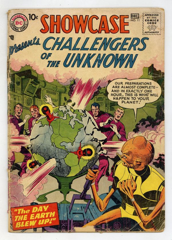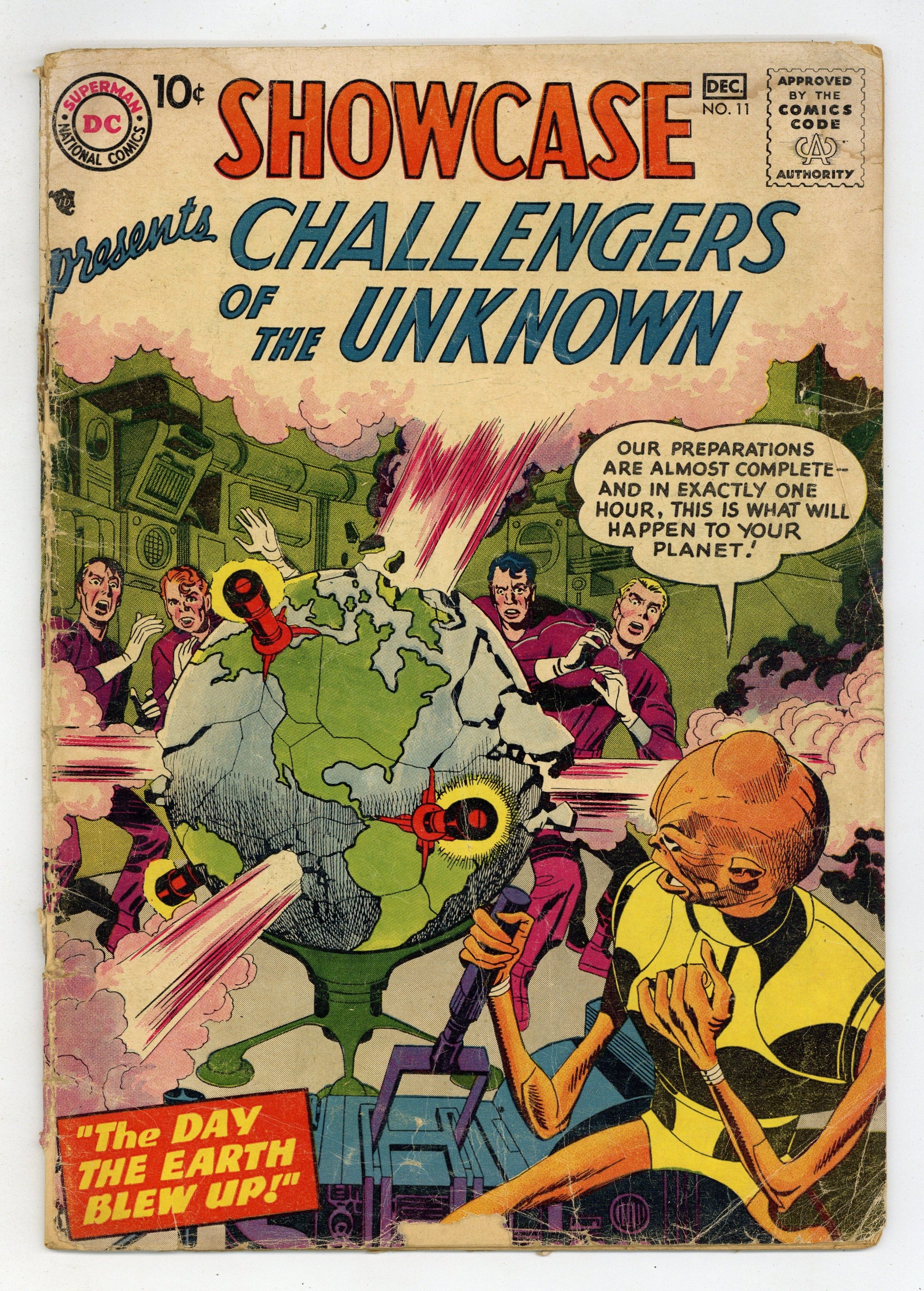 Cover art by Jack Kirby. 3rd apearance of Challengers of the Unknown in The Day the Earth Blew Up, script by Dave Wood, pencils by Jack Kirby, inks by Bruno Premiani; At the Pentagon, Navy officers and scientists are stumped; Two scientists mysteriously disappeared in Antarctica; They call in "men capable of handling the unknown," and Ace takes the call; He, Rocky, and Red fly; They'll pick up Prof along the way; Off New Guinea, Prof is astounded to find a volcano rising from the sea bed; In the Antarctic, the Challengers snow-tractor toward the mystery spot; The tractor bogs in a snowstorm and needs repairs; Ace and Rocky explore and fall through thin ice!; They land on a futuristic bridge; Above, Prof and Red are captured by skinny orange aliens in bubble-suits. Just Imagine story, art by Virgil Finlay. 36 Pages, Full Color. Cover price $0.10.