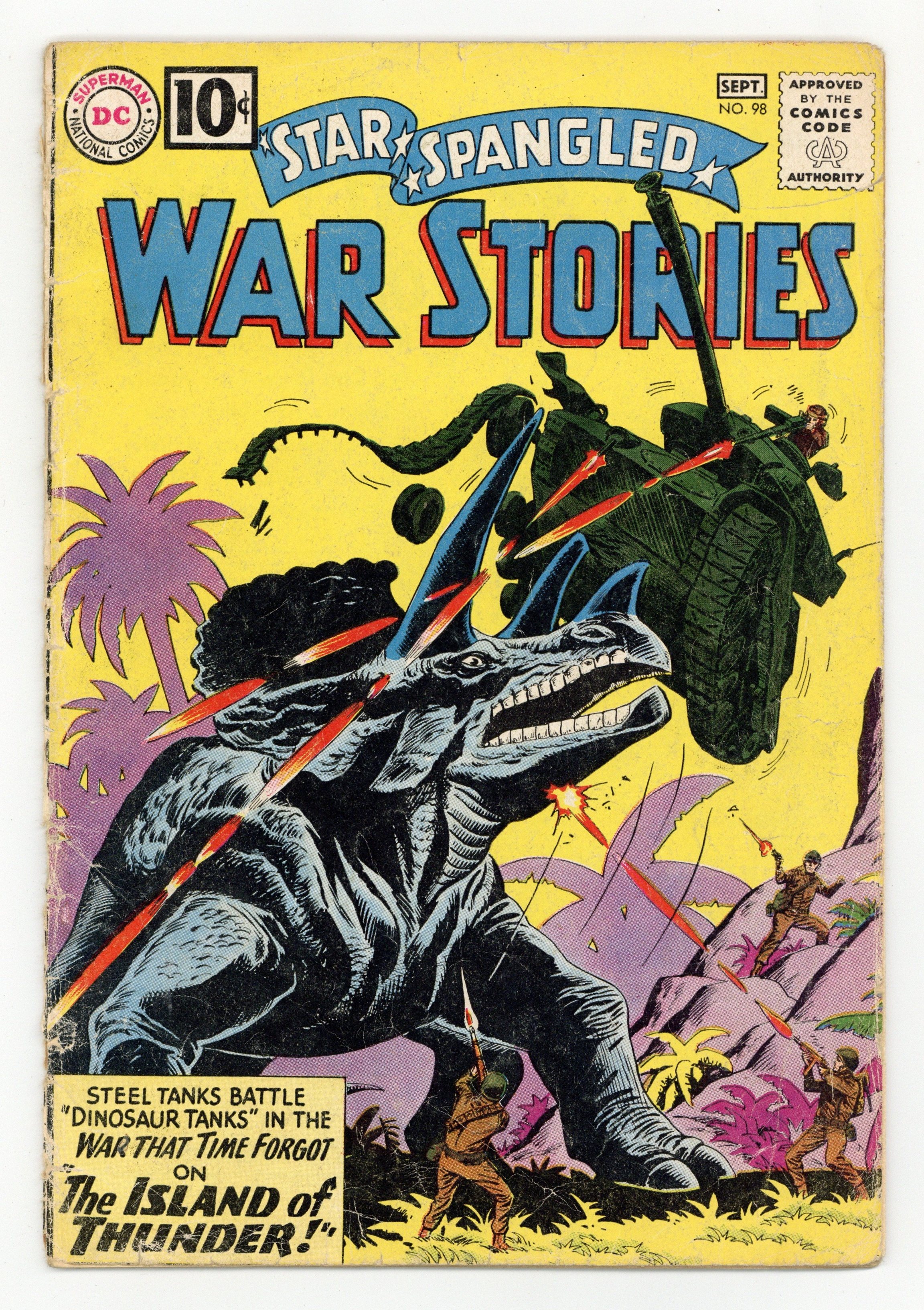 Cover pencils by Ross Andru, inks by Mike Esposito. The Island of Thunder featuring War That Time Forgot, script by Robert Kanigher, pencils by Ross Andru, inks by Mike Esposito. No Room to Fight, script by Bob Haney, art by Irv Novick. Last Shot of the Triggerfish, script by Bob Haney, art by Joe Kubert. Crests of the Army fact page, script and pencils by Morris Waldinger, inks by Tom Nicolisi. 36 Pages, Full Color. Cover price $0.10.
