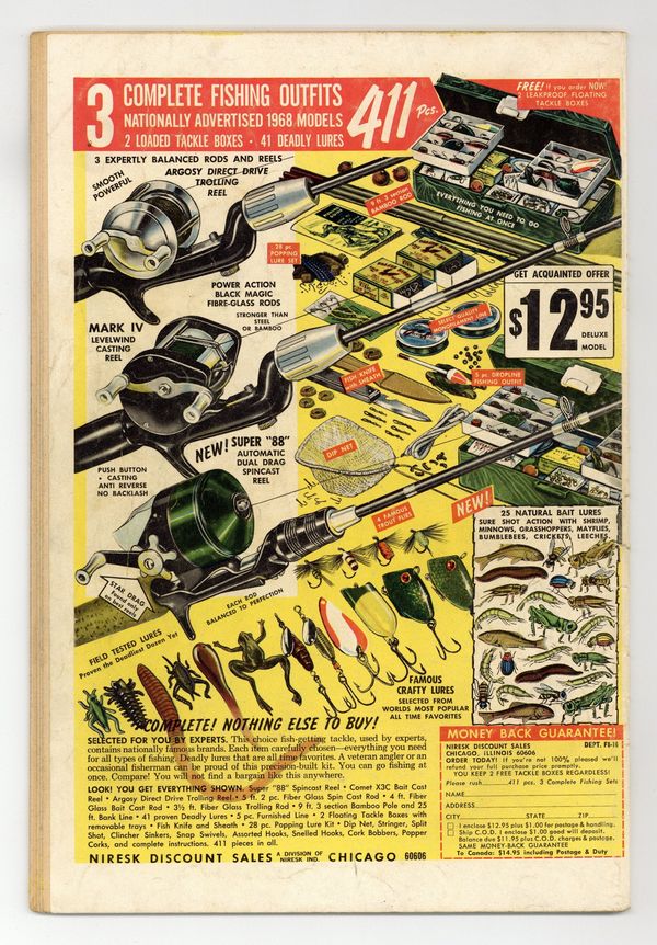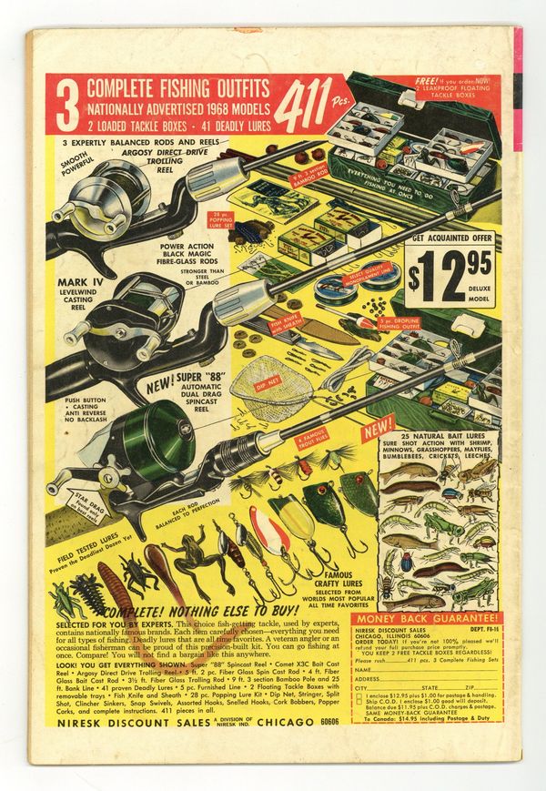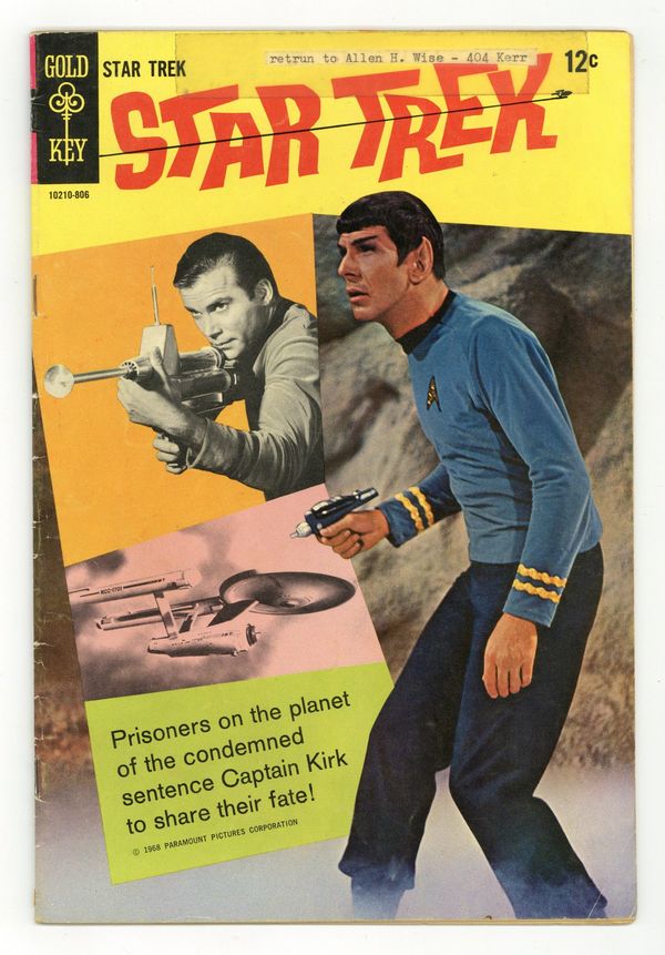 Tags: Star Trek$85.00Comic book version of the original Star Trek TV series that starred William Shatner and Leonard Nimoy. Photo cover of Leonard Nimoy & William Shatner. Photo of William Shatner, Leonard Nimoy, & DeForest Kelly on inside front cover. There are 2 versions of this comic. This version has an ad on the back cover. The other version has a photo back cover. "Part I: The Devil's Isle of Space," script by Dick Wood, art by Nevio Zeccara; Kirk and his landing party lands on an asteroid only to find it is inhabited by condemned convicts awaiting an unusual execution. "Part II: The Secret of... Execution Asteroid," script by Dick Wood, art by Nevio Zeccara; The asteroids are unstable and explode at random times; Once Kirk and his team is captured their fates seemed sealed. 36 pgs., full color. $0.15. Cover price $0.12.