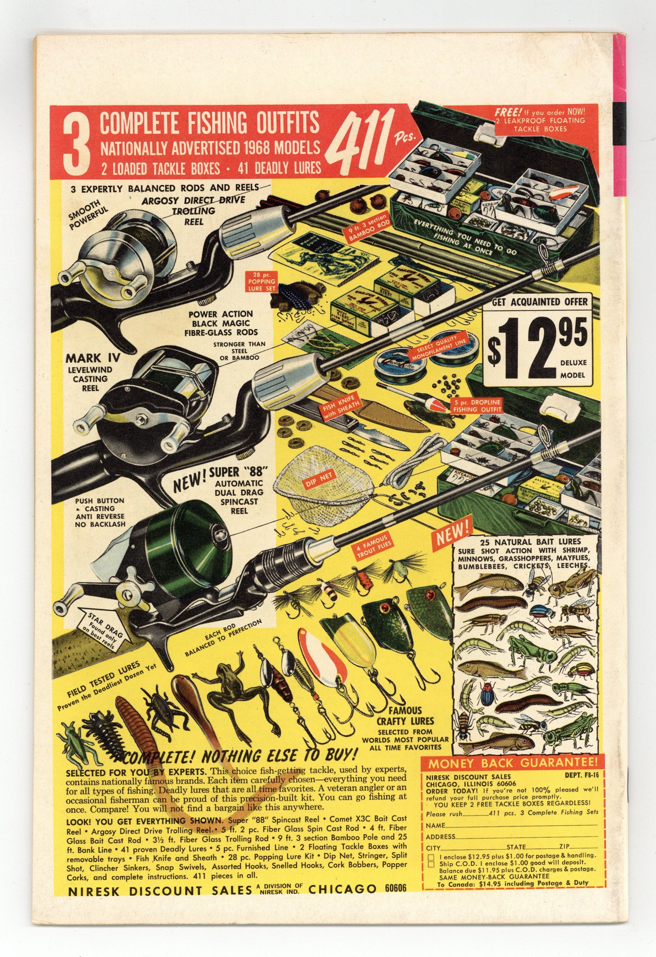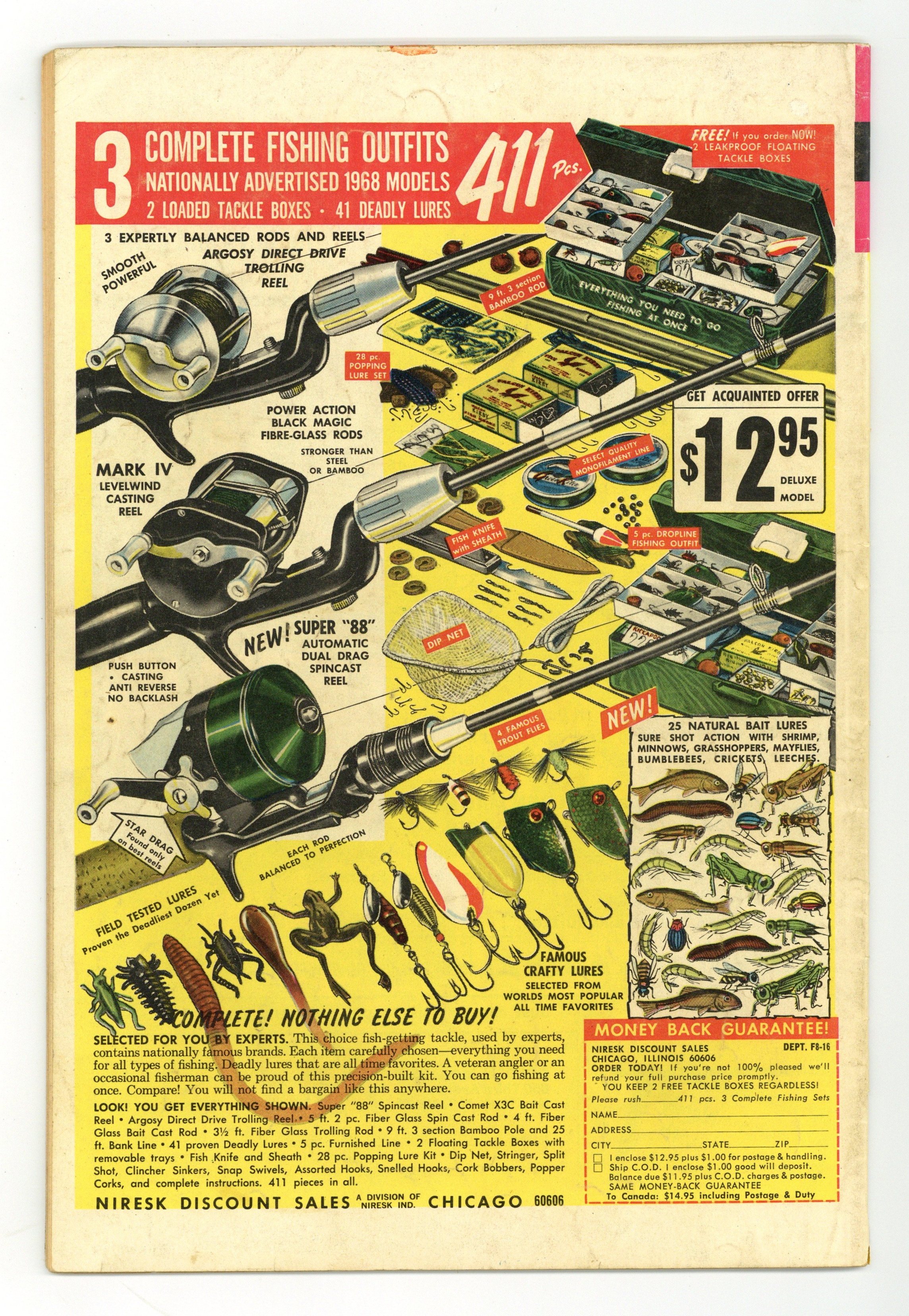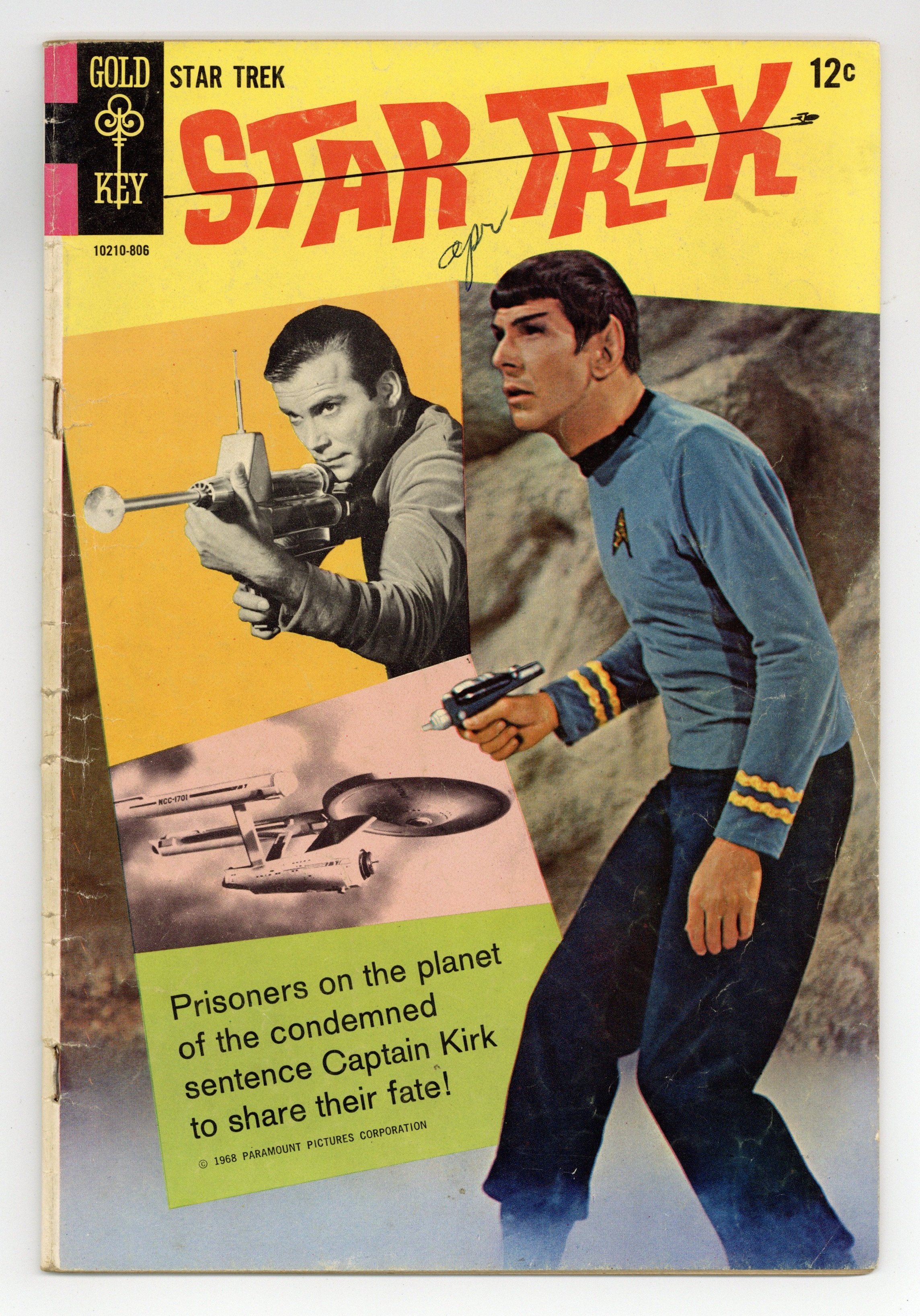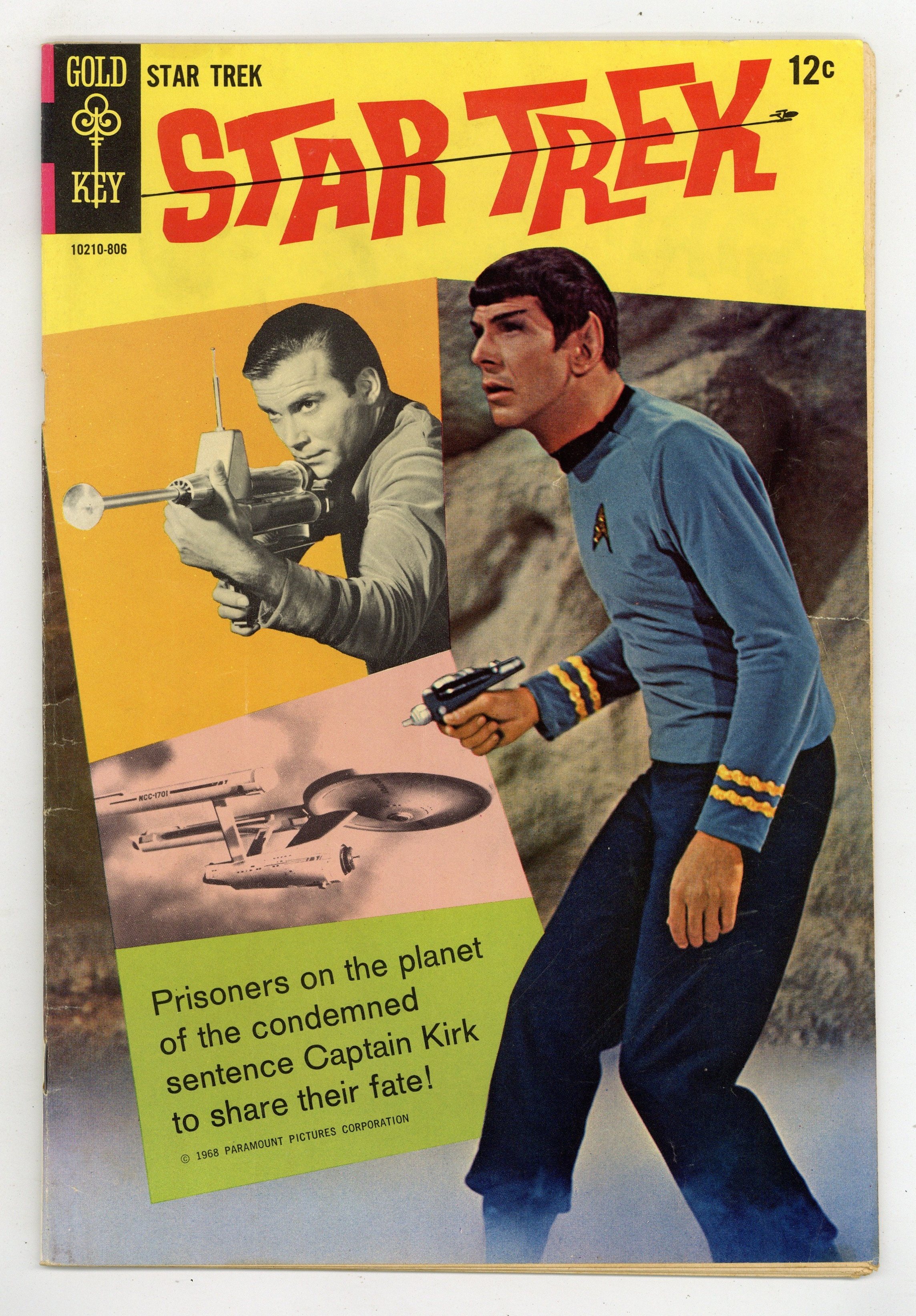 Comic book version of the original Star Trek TV series that starred William Shatner and Leonard Nimoy. Photo cover of Leonard Nimoy & William Shatner. Photo of William Shatner, Leonard Nimoy, & DeForest Kelly on inside front cover. There are 2 versions of this comic. This version has an ad on the back cover. The other version has a photo back cover. "Part I: The Devil's Isle of Space," script by Dick Wood, art by Nevio Zeccara; Kirk and his landing party lands on an asteroid only to find it is inhabited by condemned convicts awaiting an unusual execution. "Part II: The Secret of... Execution Asteroid," script by Dick Wood, art by Nevio Zeccara; The asteroids are unstable and explode at random times; Once Kirk and his team is captured their fates seemed sealed. 36 pgs., full color. $0.15. Cover price $0.12.