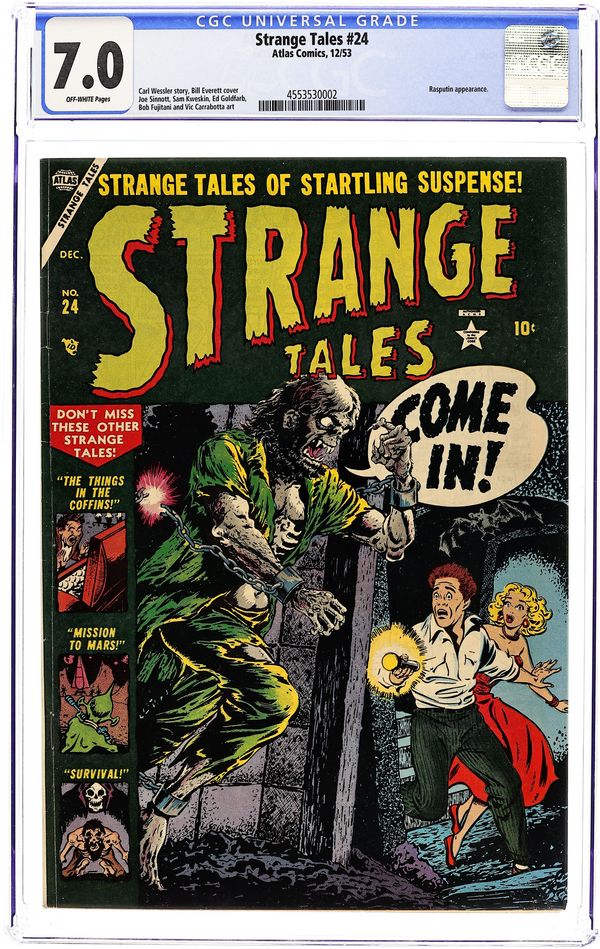 Cover art by Bill Everett. "The Things in the Coffins," art by Joe Sinnott; A drifter takes a job as cemetery caretaker, but when he notices that none of the tombstones have names, he digs one up only to uncover a buried invasion force from Pluto. "A Man of Decision" text story. "Mission to Mars!", art by Ed Goldfarb; In 2253 a diplomatic mission is sent to Mars to trade for food as Earth has been ravaged by atomic war; All of the men take their mission very seriously, except the young pilot who is kind of a class clown; He has a doll which resembles the captain and he makes it do a silly dance but the other men find no humor in his antics. "Russia!", script by Carl Wessler, art by Sam Kweskin; As Anastatia Romanov lies dying, she remembers the events of the Russian revolution and the execution of her family, along with the curse of Rasputin that if harm were to come to him Russia would be ruined. "Come In!", art by Vic Carrabotta; A young man about to enlist visits a fortune teller as he wishes to know if he will be killed in war; The fortune teller gazes into her crystal ball and tells him no, and he is relived until she hands his money back. "The Fat Man," art by Bob Fujitani; The ship's cook and two sailors are stuck on a life raft that reaches an island; The native chief lets the two skinny sailors go, but puts the obese cook in a caldron, as he is quite fat from eating food he hoarded from his comrades. 36 pgs., full color. Cover price $0.10.