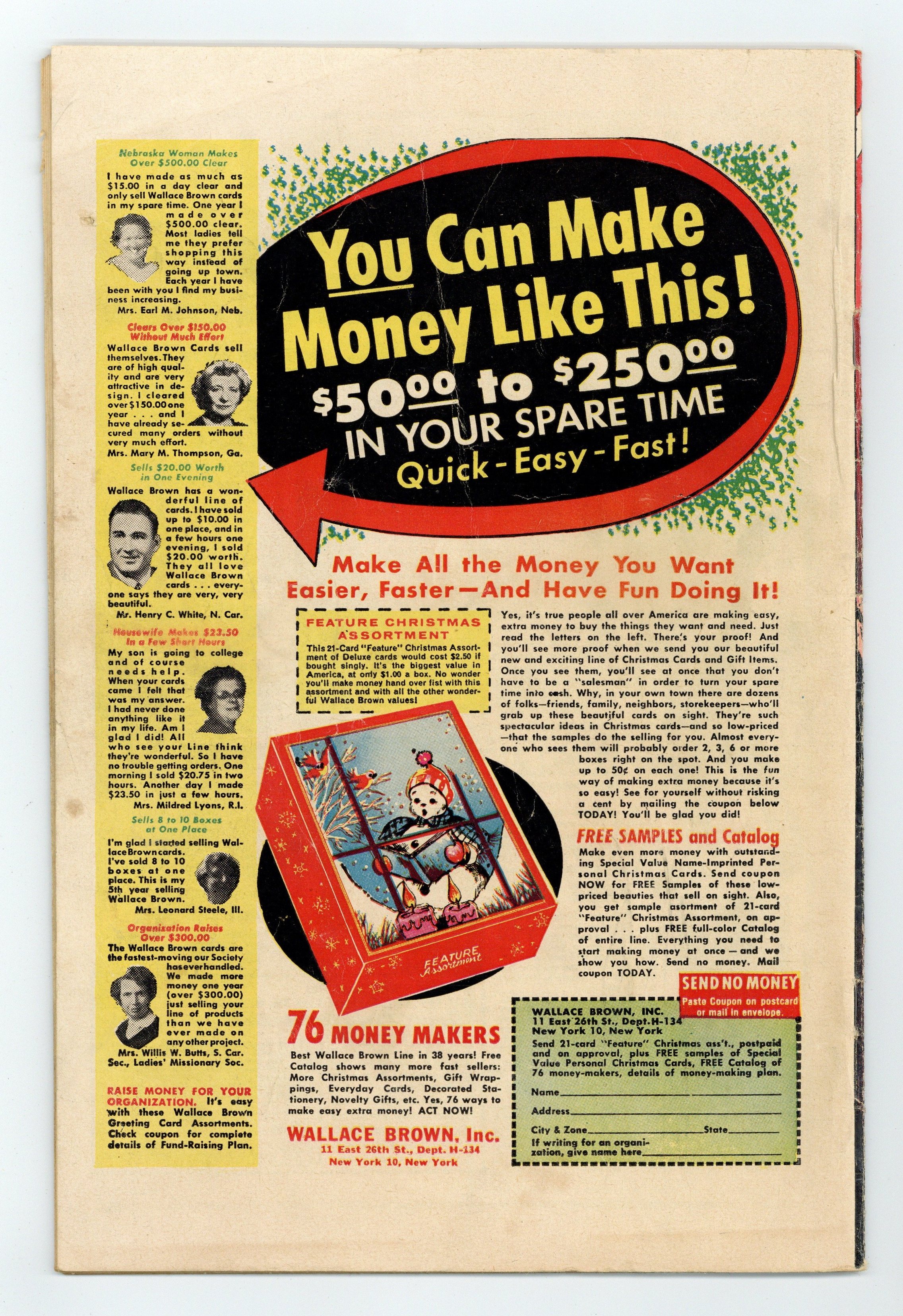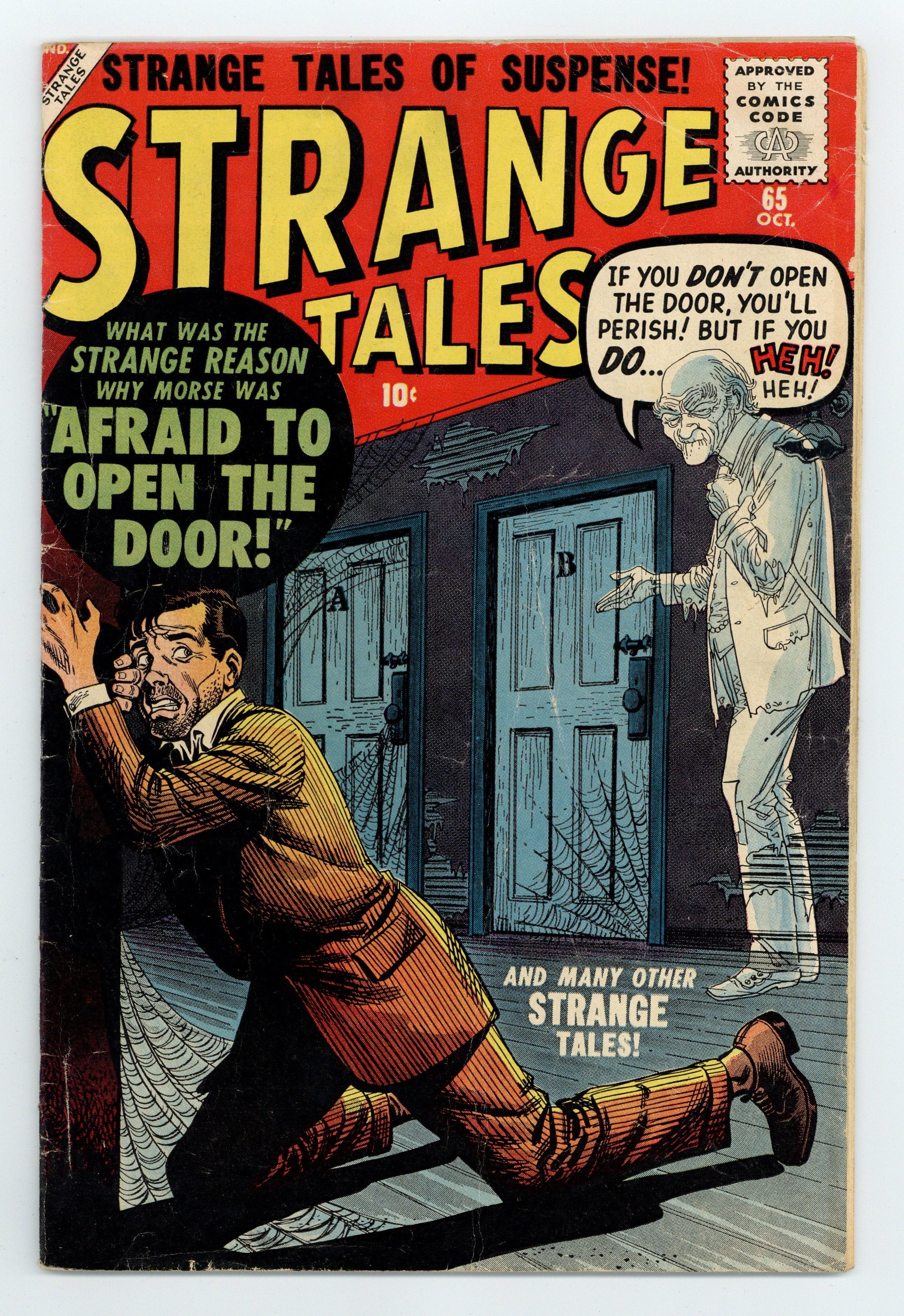 Cover art by Joe Maneely. "Afraid To Open the Door!", art by Dan Loprino; A thief trying to rob a reclusive scientist finds him in a room with two doors; The scientist tells him if he leaves through the wrong door he will be trapped in a shadow world of strange creatures. "The House That Cried!", art by Christopher Rule; A hobo tries to rob an old woman in a dilapidated house who turns out to be a ghost. "The Ragged Man," art by Richard Doxsee; A heartless businessman gets what's coming to him when the Geiger counter he keeps on his yacht goes off and he spends all his money buying worthless land because he thinks that there is a fortune in uranium underwater. "The Terrible Tree!", art by John Forte; A man weakens a large redwood tree so that it will fall on his farm and he can collect on the insurance policy; Objects made from the tree pursue vengeance upon him. "The Perfectly Frightened Man," art by Robert Q. Sale; A man is convinced by his wife that he is the victim of a hoax designed to make him think he has inherited sorcerous powers, but when he says "I'll be a monkey's uncle", he turns into one. "The Missing Film" text story, art by John Severin. "When the Curtain Falls!", art by Bernard Baily; A jealous stagehand swaps a real dagger for a rubber prop hoping that his actor rival will stab himself and he will be free to pursue his love interest without competition. 36 pgs., full color. Cover price $0.10.