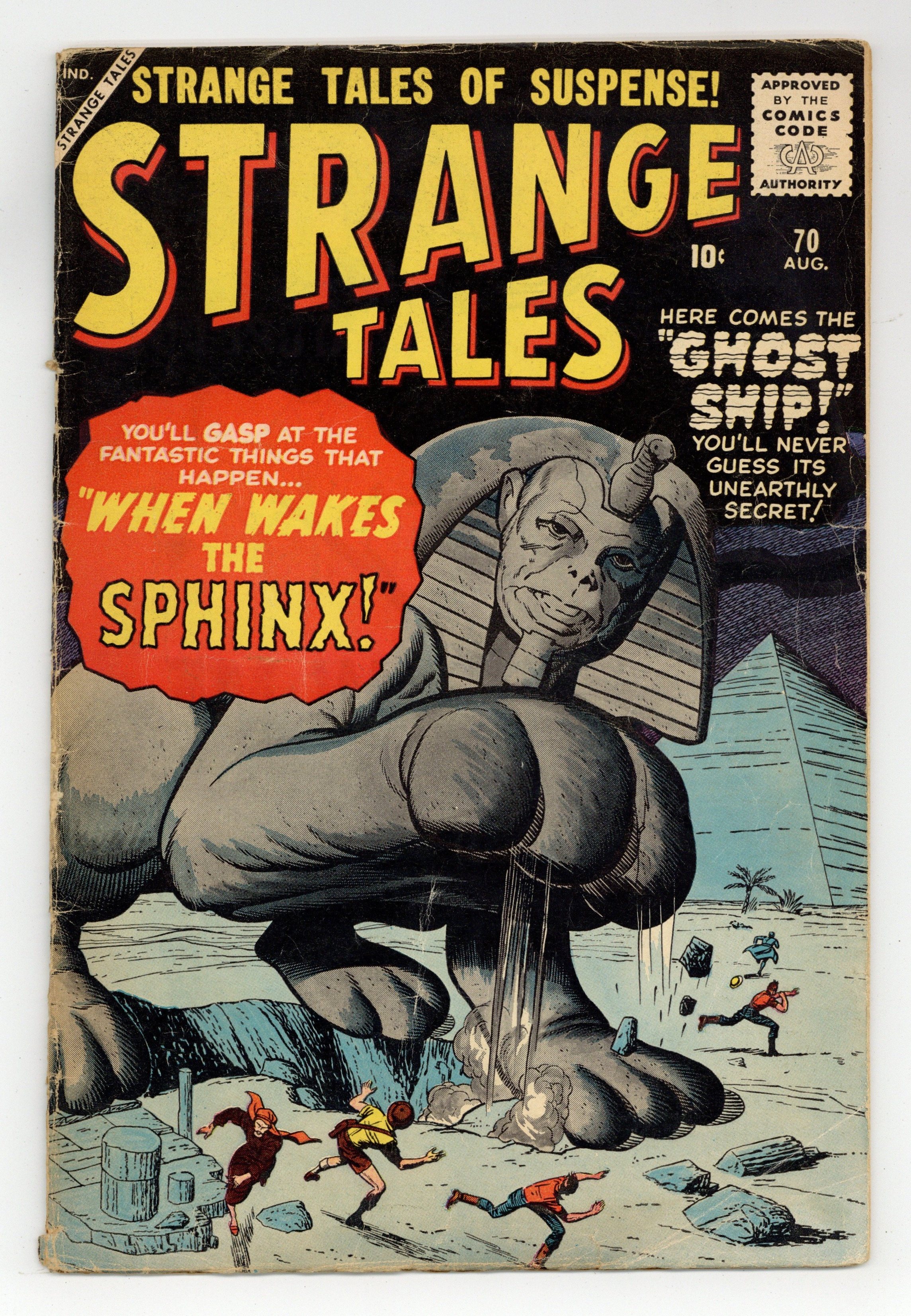 Tags: Marvel Legacy Numbering: Doctor Strange (part 70)$147.00Prototype issue (Giant Man). Cover pencils by Jack Kirby, inks by Dick Ayers. "A Giant Walks the Earth!", pencils by Jack Kirby, inks by Christopher Rule; A short lab assistant works on a growth serum to gain a normal man's height; The serum works too well, and he continues to grow so tall his life is endangered when the air becomes too thin to breathe. "The Comic" text story. "Earth in Chains!", art by Paul Reinman; Aliens from the planet Regulus colonize Earth, treating humans as little more than animals; They must withdraw only because of their vulnerability to Earth's germs. "Ghost Ship!", art by Carl Burgos; The US Coast Guard finds an abandoned Soviet submarine; The log book shows that they mistook an alien craft for an experimental American ship and tried to ram it. "Escape to Tomorrow!", art by Paul Reinman; A criminal hears of the invention of a time machine; He robs a bank and then escapes 50 years into the future; Once there, he discovers that under the new world government, US money is useless. "When Wakes the Sphinx!", art by Steve Ditko; An Egyptian and a tourist see the Sphinx come to life and chase off Alien invaders. 36 pgs., full color. Cover price $0.10.