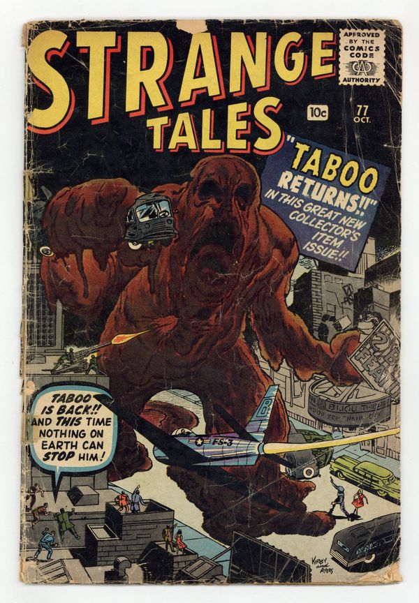 Cover pencils by Jack Kirby, inks by Dick Ayers. "The Return of Taboo!", pencils by Jack Kirby, inks by Dick Ayers; After his apparent destruction, Taboo reconstitutes himself and runs amok; He is eventually stopped by the arrival of others from his world. "Mystery Pupil" text story, art by Joe Maneely. "I Am the Beast-Man!", art by Don Heck; A criminal transforms himself into a dog in order to escape from burglaries unnoticed; He must return home quickly or be stuck as a dog, but is picked up by a dog catcher and trapped in the pound. "The Strange Magic of Master Khan!", art by Steve Ditko; A pirate steals the ship of an Asian sorcerer; The ship's owner curses the thieves, shrinking the ship and imprisoning them in a glass bottle. "Am I the...Unhuman?", art by Paul Reinman; A scientist in builds a robot identical to himself, and programs it with his own memories; When robots are banned, the robot believes that it is the real person, and its creator the duplicate. 36 pgs., full color. Cover price $0.10.