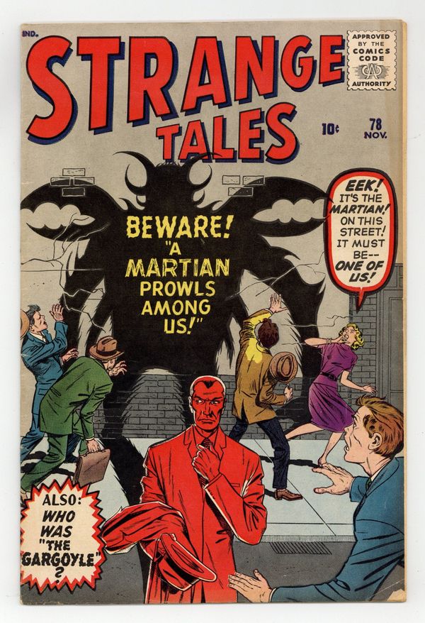 Tags: Marvel Legacy Numbering: Doctor Strange (part 78)$92.00Cover pencils by Jack Kirby, inks by George Klein. "A Martian Walks Among Us!", pencils by Jack Kirby, inks by Dick Ayers; A man spots upon a Martian in human form scouting for an invasion; The police wont believe him, so he finds and kills the spy himself, revealing that he is a Venusian in disguise working to protect Earth. "Trouble Bubble," art by Joe Maneely; A boy discovers a formula to blow unbreakable bubbles and accidentally entraps his father's boss. "The Fantastic Menace of Mento the Mighty," art by Don Heck; A scientist discovers his own innate psychic power and builds a machine to slowly enhance it; He is nearly omnipotent after more than a decade. "The Gargoyle!", art by Paul Reinman; An ugly man rejected by society applies for a job at a circus; It turns out to be a ruse by aliens who are uniformly gorgeous, and so want a man with an ugly face they find fascinating to marry their queen. "Dear Reader: What Would You Have Done if You Were the… Worm Man," art by Steve Ditko (Ant-Man prototype); A spy calling himself 'Worm Man' uses shrinking pills to easily discover military secrets; On a crucial mission, he is attacked by a rat and loses his growth pills, trapping him forever in his tiny form. 36 pgs., full color. Cover price $0.10.