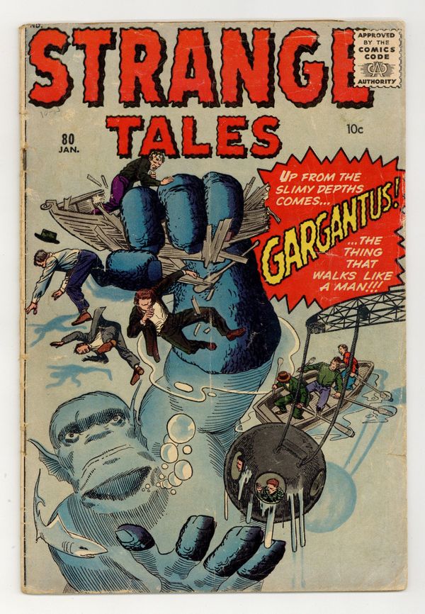 Cover pencils by Jack Kirby, inks by Steve Ditko. "What? What? What Was Gargantus!", pencils by Jack Kirby, inks by Steve Ditko; A deep sea explorer encounters a giant reptile that follows him back to the surface; The creature explores the surface, causing panic. "Time Machine" text story. "The Things from Dimension X!", art by Don Heck; A scientist successfully creates a link to the dimension Electra only to find the inhabitants bent on conquest. "The Door They Dare Not Open!", art by Paul Reinman; A prison warden treats inmates with kindness, and relies on an honor system to prevent them from opening the one closed door. "Trapped in the Room of Shadows," art by Steve Ditko; A millionaire looks for magical wishing stones with which he hopes to help all humanity; His greedy guide tries to steal the first stone, but only succeeds in using up its power and trapping himself. 36 pgs., full color. Cover price $0.10.