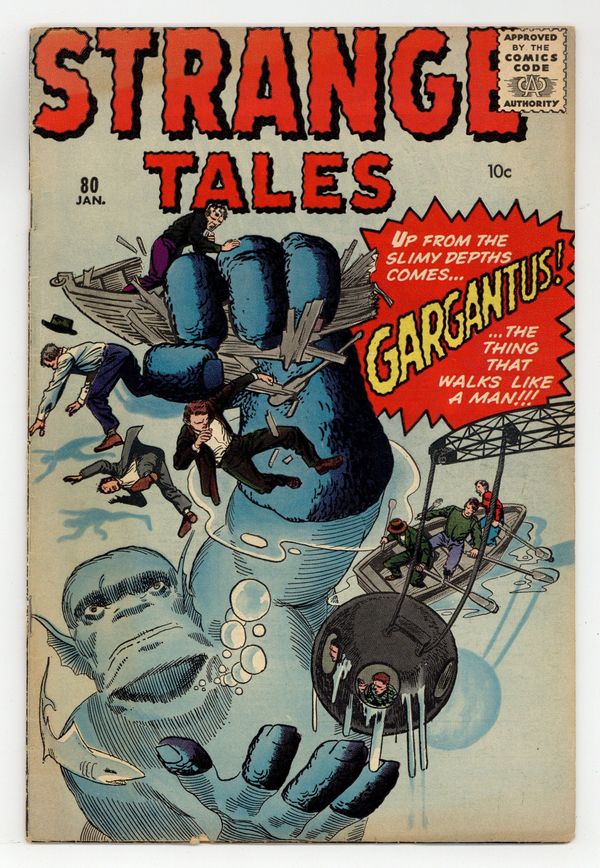 Tags: Marvel Legacy Numbering: Doctor Strange (part 80)$155.00Cover pencils by Jack Kirby, inks by Steve Ditko. "What? What? What Was Gargantus!", pencils by Jack Kirby, inks by Steve Ditko; A deep sea explorer encounters a giant reptile that follows him back to the surface; The creature explores the surface, causing panic. "Time Machine" text story. "The Things from Dimension X!", art by Don Heck; A scientist successfully creates a link to the dimension Electra only to find the inhabitants bent on conquest. "The Door They Dare Not Open!", art by Paul Reinman; A prison warden treats inmates with kindness, and relies on an honor system to prevent them from opening the one closed door. "Trapped in the Room of Shadows," art by Steve Ditko; A millionaire looks for magical wishing stones with which he hopes to help all humanity; His greedy guide tries to steal the first stone, but only succeeds in using up its power and trapping himself. 36 pgs., full color. Cover price $0.10.