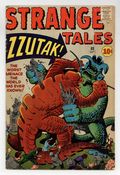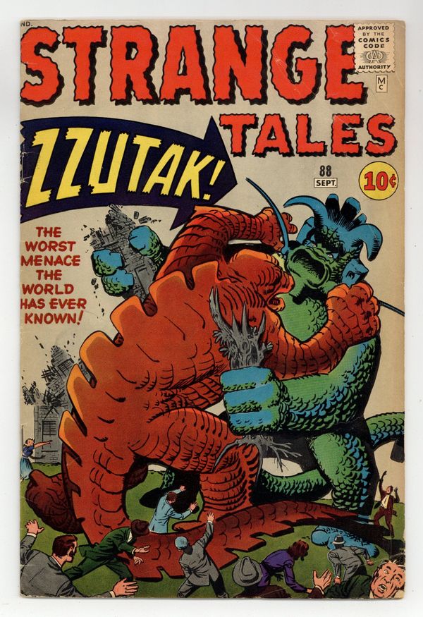 Tags: Marvel Legacy Numbering: Doctor Strange (part 88)$95.00Cover pencils by Jack Kirby, inks by Steve Ditko. "Zzutak the Thing That Shouldn't Exist!!", pencils by Jack Kirby, inks by Steve Ditko; An American comic book artist is forced by an Aztec priest to make a monster with magic paints; The artist creates another monster to fight the first, causing the temple to collapse on both monsters. "Snowstorm" text story. "The Lifeless Man!", art by Steve Ditko; A young boy prefers an old wooden toy soldier to more modern toys; His friends make fun of the toy, but when they are threatened by a bear the soldier seems to drive it off with its rifle. "Punishment!", art by Don Heck; An advanced civilization sends a mugger to a prison planet; Only a few moments on this world full of war, crime and disease make him go straight in order to avoid ever again coming back to Earth. 36 pgs., full color. Cover price $0.10.