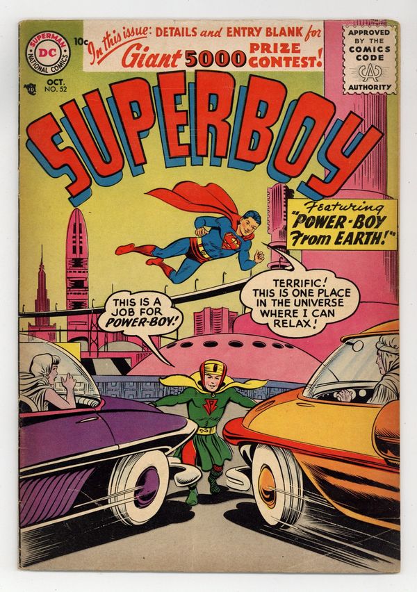 Cover pencils by Curt Swan, inks by Stan Kaye. The Heroine of Smallville, script by Otto Binder, art by John Sikela; Lana believes an amulet her father has given her has magical properties. How to Spend a Summer Week! public service announcement starring Binky, script by Jack Schiff, art by Win Mortimer. The Power-Boy from Earth, script by Otto Binder, pencils by Curt Swan; Superboy visits an asteroid where he meets a boy with super powers just like his. The Super-Robot, script by Otto Binder, pencils by Curt Swan; Two crooks try to peddle a Superboy robot that's supposed to have all his powers. 36 Pages, Full Color. Cover price $0.10.