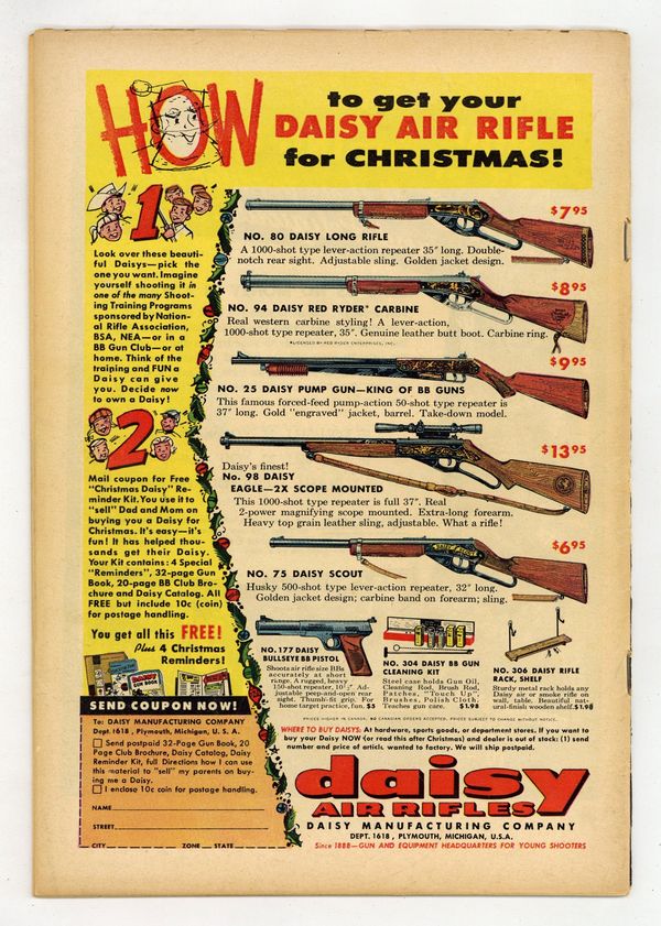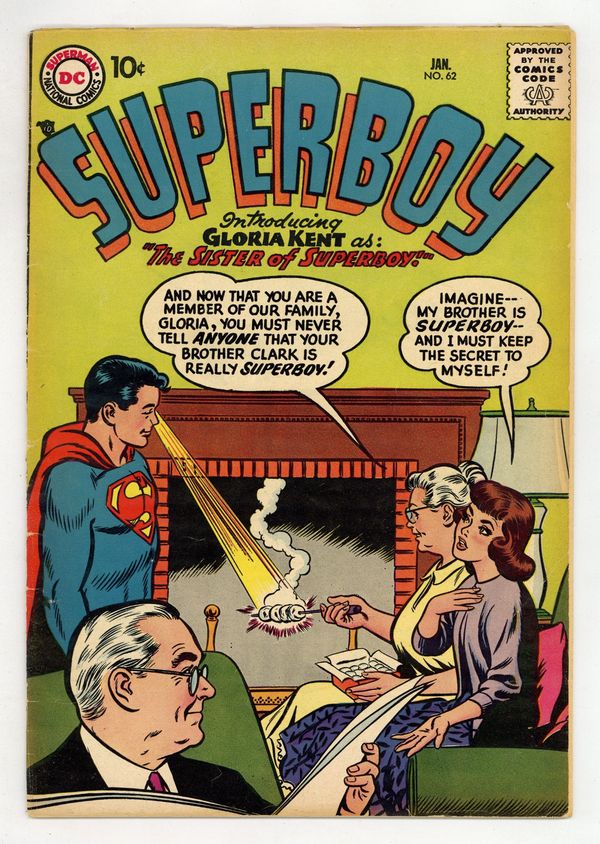 Tags: Superman$46.00Cover pencils by Curt Swan, inks by Stan Kaye. The Story of Superboy's Sister, script by Alvin Schwartz, art by Al Plastino; A strange girl turns up in Smallville with a letter from Superboy's mother, in Kryptonese! Little Pete humor page by Henry Boltinoff. The Super-Clown of Smallville!, script by Jerry Coleman, art by Creig Flessel. The First Moving Pictures text article. Wanted: A Teen-Age Code public service announcement, script by Jack Schiff, art by Ruben Moreira. The Wildest Weather in the World, script by Otto Binder, art by John Sikela; Professor Lang returns from an expedition with an idol that will curse the town with disastrous weather if it sees the color green. 36 Pages, Full Color. Cover price $0.10.