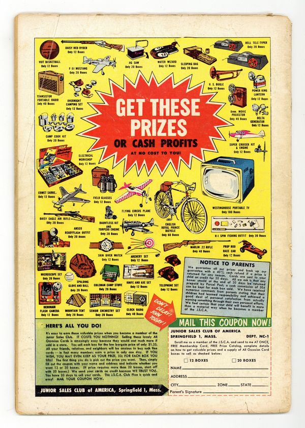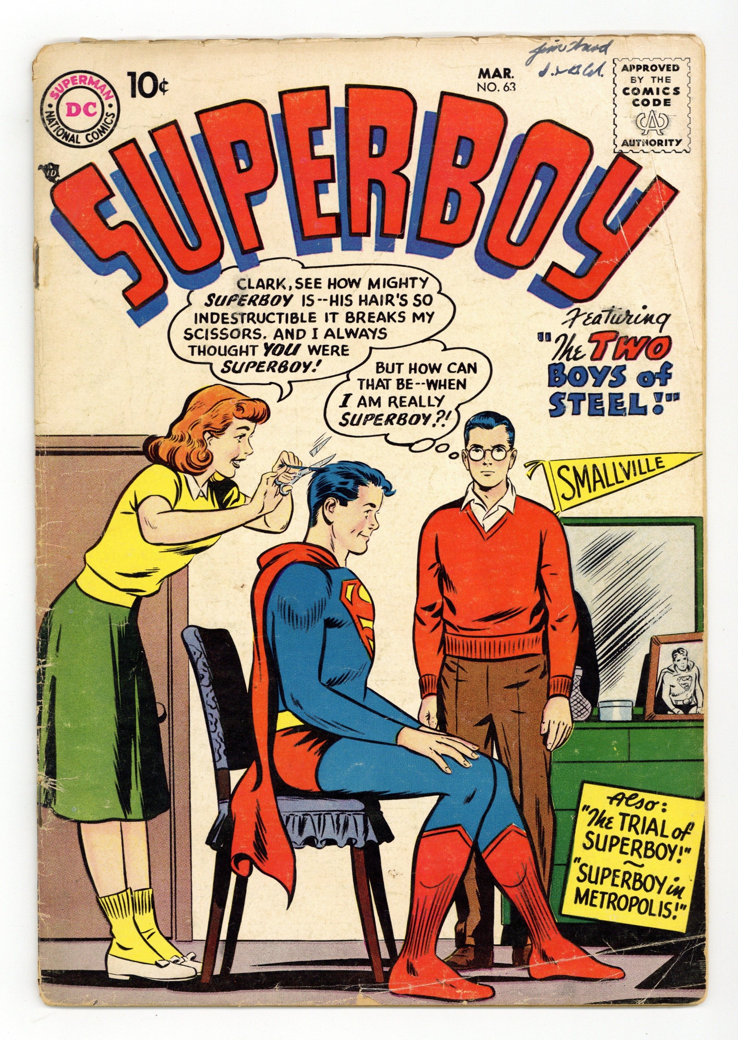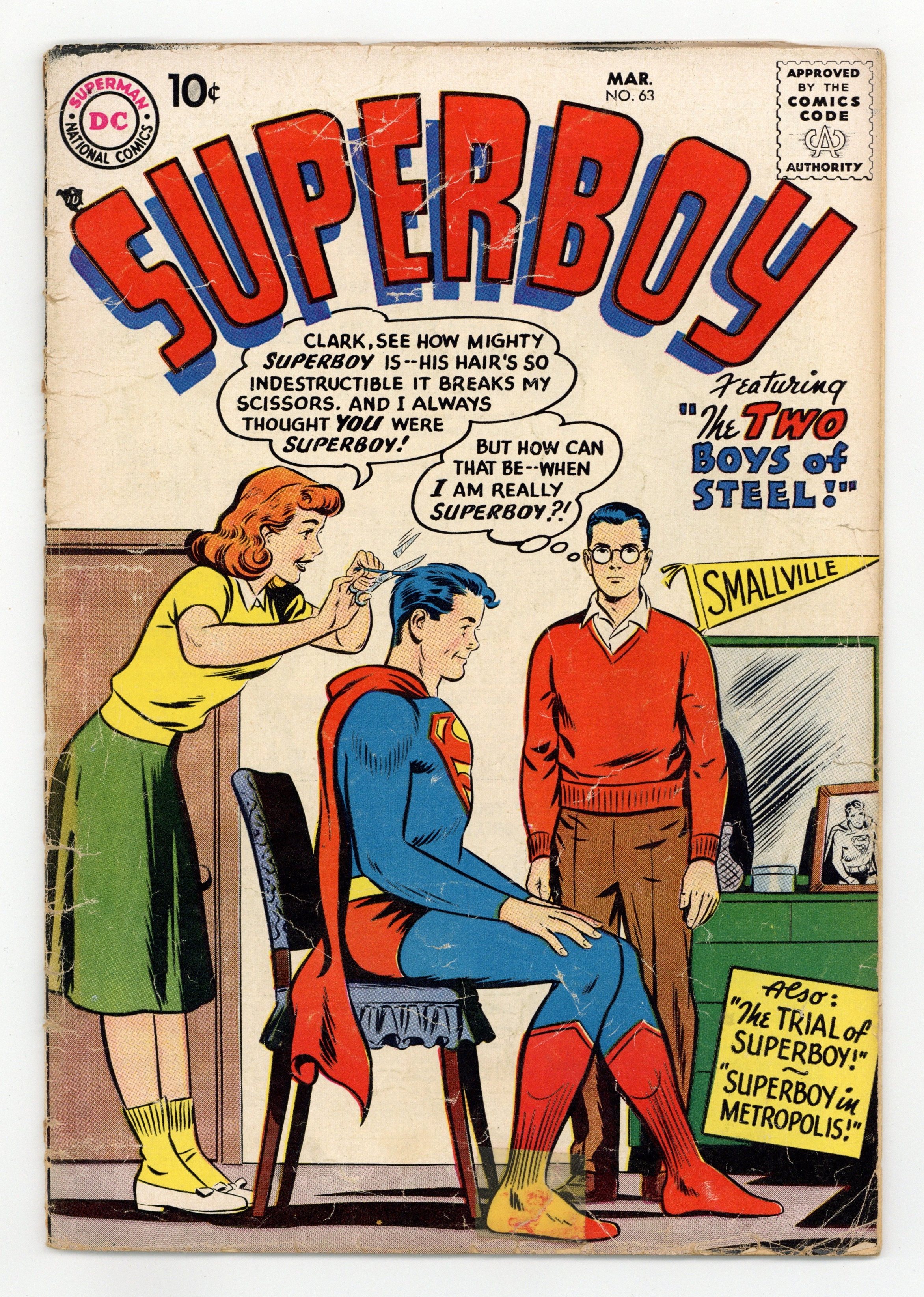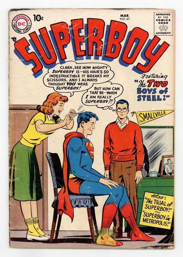 Cover pencils by Curt Swan, inks by Stan Kaye. "The Trial of Superboy," art by Creig Flessel; To keep a secret laboratory from coming to the attention of enemy agents, Superboy agrees to cooperate with a hoax in which a fragment of the rocket that brought him to Krypton is said to have burned down a Smallville business. Superman's Girl Friend, Lois Lane ad. Tricksy humor page by Henry Boltinoff. "Clark Kent, Cub Reporter," script by Otto Binder, art by John Sikela; Clark applies for a summer job at the Daily Planet. Do You Know What's Behind a Law? public service announcement, script by Jack Schiff, art by Bob Brown. Games that Test Your Brain Power text article. "The Two Boys of Steel," script by Jerry Coleman, pencils by Curt Swan, inks by Stan Kaye; Superboy has amnesia and moves into Lana's house. 36 Pages, Full Color. Cover price $0.10.