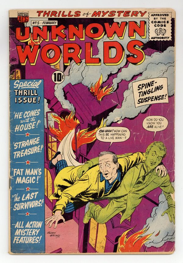$7.60"He Comes With the House!" (script by Richard Hughes as "Kurato Osaki"; art by John Rosenberger); "Strange Treasure!" (script by Hughes as "Pierre Alonzo"; art by Odgen Whitney); "Fat Man's Magic!" (script by Hughes as "Zev Zimmer"; art by Pete Costanza); and "The Last Survivors!" (script by Hughes as "Shane O'Shea"; art by Whitney). Whitney cover. Cover price $0.10.