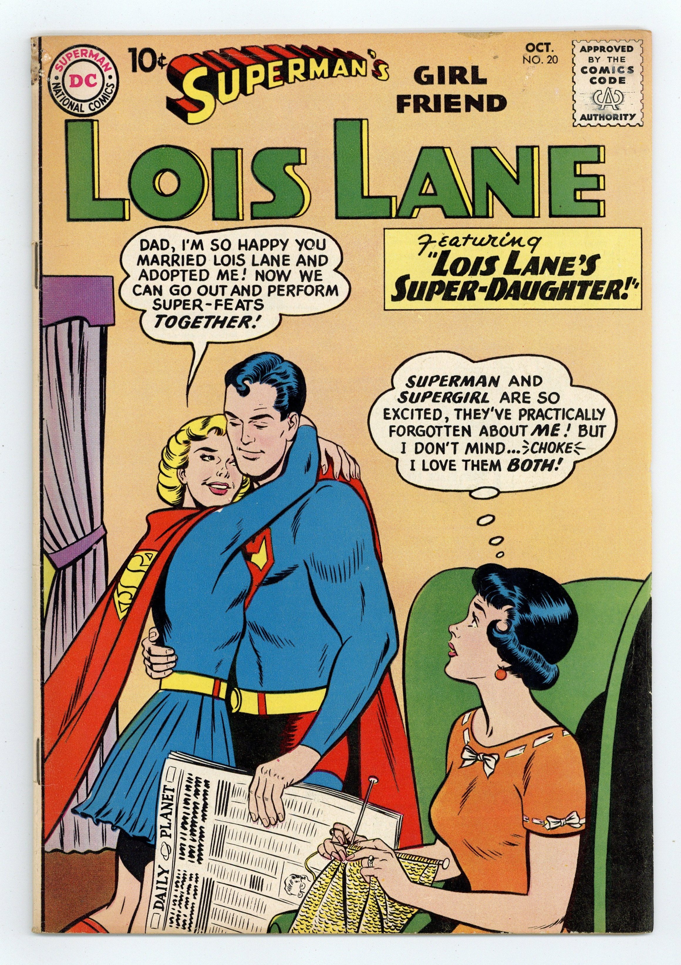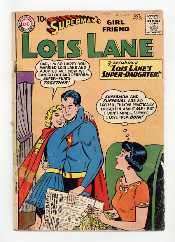 Cover pencils by Curt Swan, inks by Stan Kaye. Superman's Flight from Lois Lane!, script by Jerry Siegel, art by Kurt Schaffenberger; Superman decides to go back into the past and start over his life in Metropolis in order to avoid ever meeting Lois Lane. But somehow he can't seem to escape her. The Luckiest Girl in Metropolis!, pencils by Al Plastino; Lois is blinded temporarily and believes it's given her premonitions. House ad for Superman Annual #1. Lois Lane's Super-Daughter!, script by Jerry Siegel, art by Kurt Schaffenberger; In this imaginary story, after Superman reveals his secret identity to Lois, Lois and Clark marry, and Clark reveals that his Kryptonian cousin also resides on Earth. 36 Pages, Full Color. Cover price $0.10.
