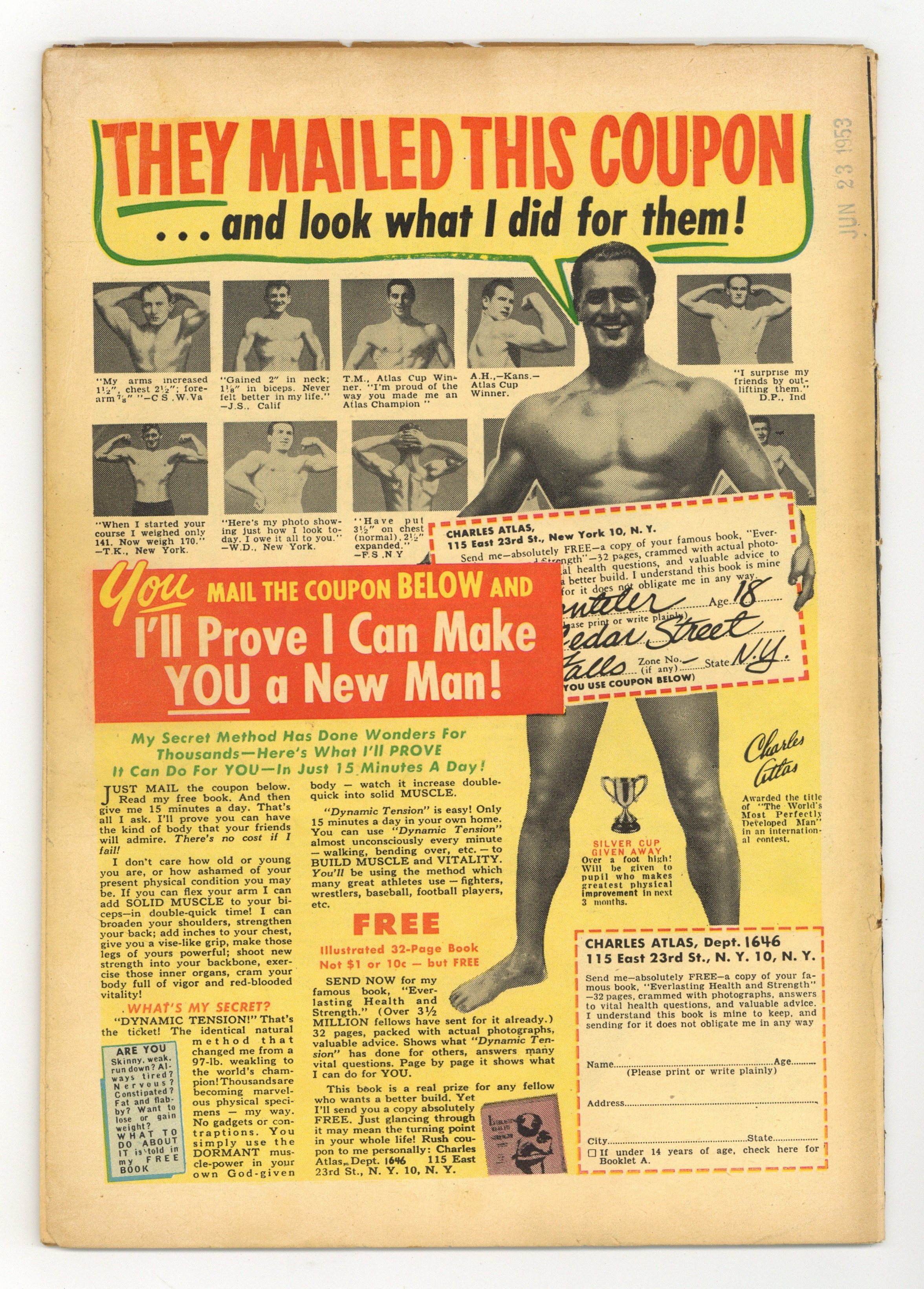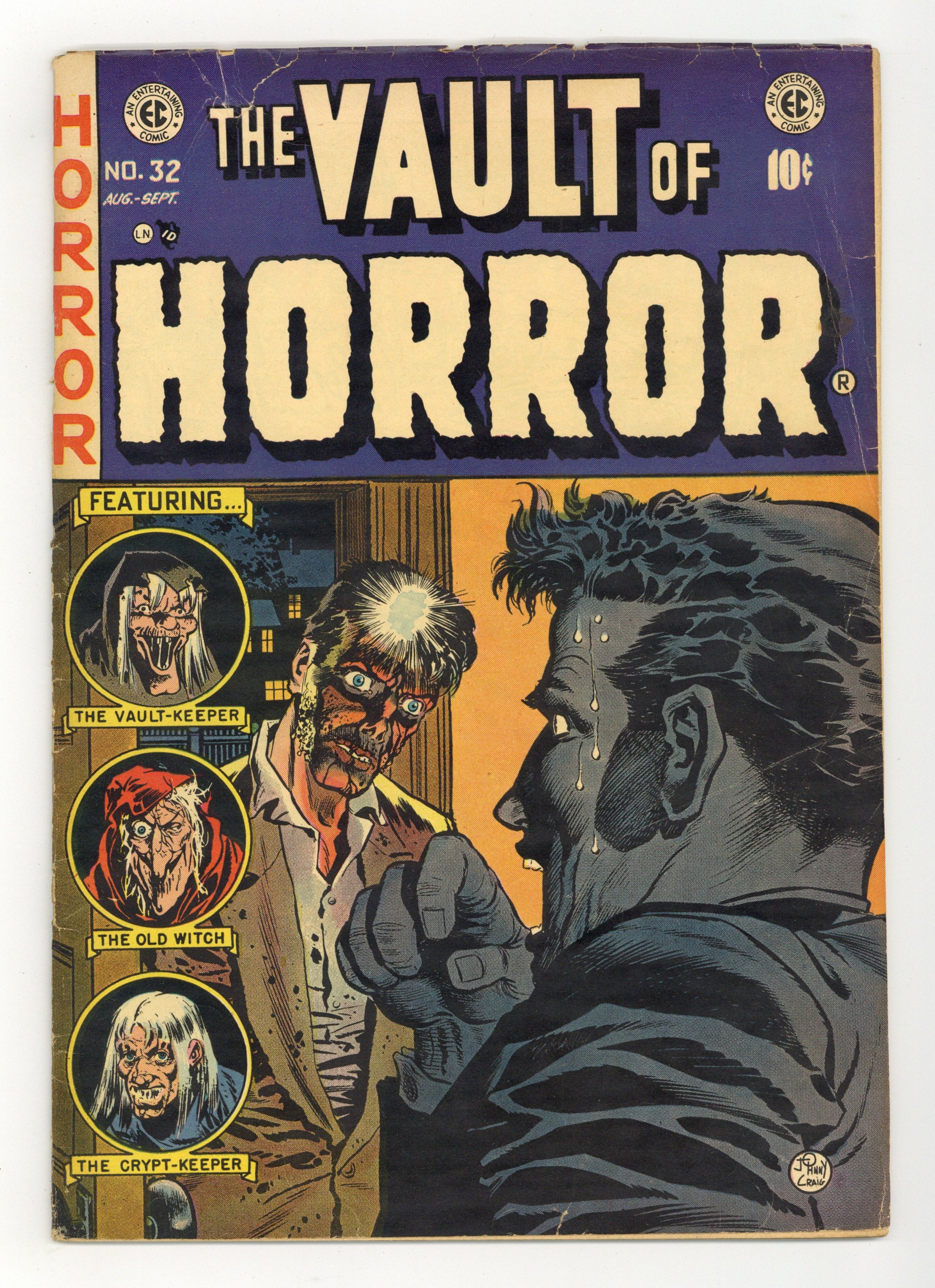 Cover by Johnny Craig. Ad for MAD magazine. "Whirlpool," script and art by Johnny Craig; Her mind was whirling as three horrid creatures hovered over her, asking her name, and she ran to escape; A series of events: thrown into boiling water, plunged into ice, poked with a hypodermic, strapped into an electric chair, and put into a small room that kept shrinking. "Out of His Head!", script by Al Feldstein, art by Jack Davis; Alex had murdered Stanley with an axe to his head, trying to blame the death on a maniac; It seemed, however, that the dead man kept haunting him. "Crash Landing!" text story. 'An Ample Sample," art by George Evans; Irwins wife Hannah gets fat from eating too many chocolates; he admits to killing her. "Funereal Disease!", script by Bill Gaines (co-plot) and Albert B. Feldstein (co-plot, script), art by Graham Ingels (as Ghastly); Jasper went to his cottage on the Fairchild Estate and counted up the money he had been saving, a total of $4970, and knew as soon as Mr. Fairchild paid him the last $30 he owed him, he'd be set.... set to have the funeral that was denied to his parents. 36 pgs., full color. $0.10. Cover price $0.10.