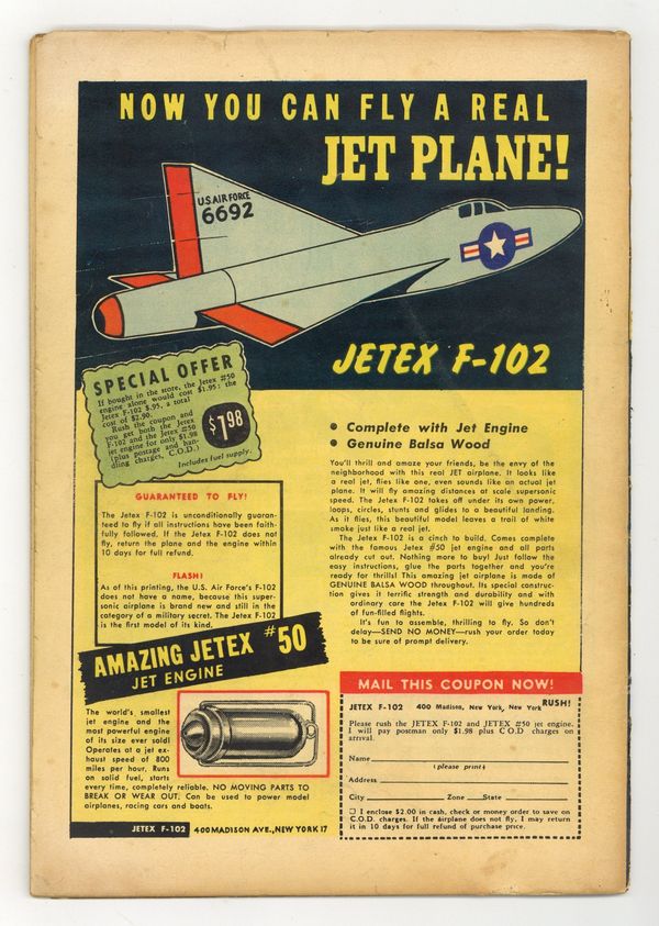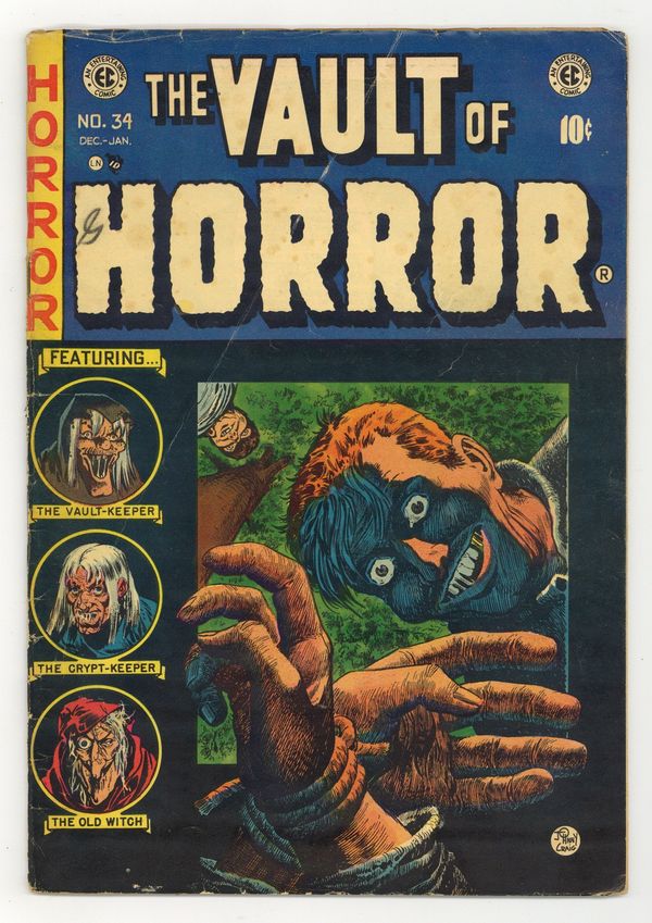$420.00Cover by Johnny Craig. E.C. Fan-Addict Club promo. "Star Light, Star Bright!", script and art by Johnny Craig; As falls in sheets, Hartley stands over the open coffin as he nervously and sickeningly watches people run up to the corpse and do terrible things to it. "While the Cat's Away...", art by Jack Davis; John and Frank work their little travel agency scam for almost a year; they book trips for wealthy clients, then clean out their homes of valuables while they are away. "Sudden Death!" text story. "Smoke Wrings," art by Reed Crandall; Nervously, Hubert waited to see Miss Jackson about the Llama Cigarette account, and when he did get to see her, he proffered ideas to her concerning new revolutionary billboard ads using live steam; someone gets scalded to death. "Where There's a Will...", art by Graham Ingels (as Ghastly); The relatives of Harold Farber are gathered in his house, awaiting his certain death while Dr. Crotty and lawyer Walker go upstairs to see the old man, and tell him what vultures they really are. 36 pages, full color. Cover price $0.10.
