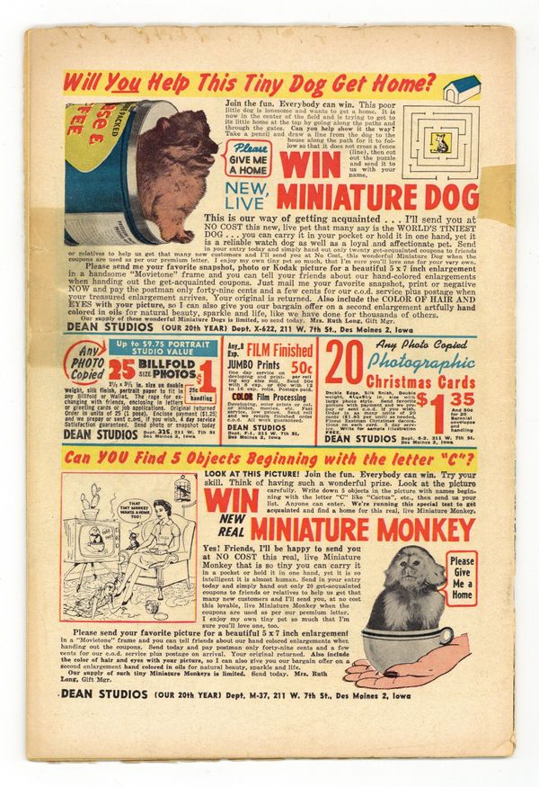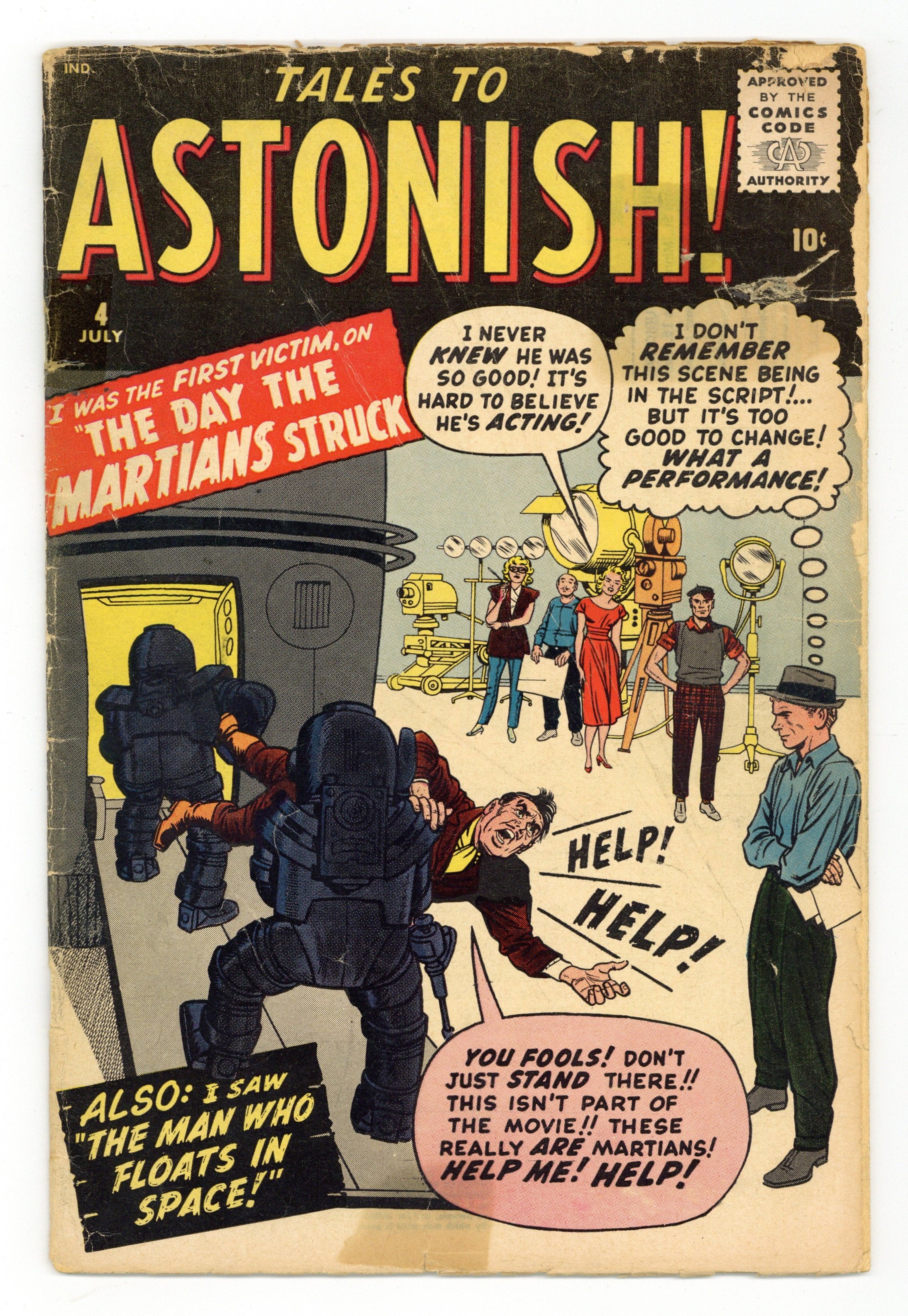 Cover by Jack Kirby and Christopher Rule. I Was a Prisoner of the Martians!, art by Joe Sinnott; A bullying director is kidnapped by Martians using the science fiction movie he's filming as a cover. Masquerade text story. My Forbidden Paintings!, art by Don Heck; A painter buys a magic brush with the power to make three paintings become real. He makes himself handsome and a famous painter. I Made Time Stand Still; An inventor accidentally makes time stand still, leaving himself the only person able to move. I Love a Mermaid!, art by Carl Burgos; A man always drawn to the sea falls in love with a mermaid. The Man Who Floats in Space!, art by Steve Ditko. 36 pgs., full color. $0.10. Cover price $0.10.