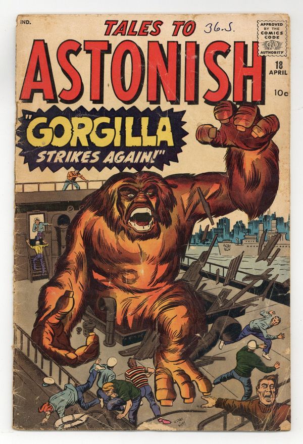 Starts May 18 Cover by Jack Kirby and Dick Ayers. Gorgilla Strikes Again! Part 1, art by Jack Kirby and Dick Ayers; Gorgilla stows away on a ship to America to contact the human race, but is met with fear and violence in New York. Gorgilla Strikes Again! Part 2, art by Jack Kirby and Dick Ayers. The Stranger, art by Joe Maneely. Monsteroso, art by Steve Ditko; A creature hatches from an egg and imagines itself lord of all it surveys, but it is suddenly drowned, as it is only a microbe in a scientist's culture. Robot on the Rampage!, art by Steve Ditko; A robot stationed at a lighthouse rebels against his human master and the man manages to lock the robot outside where the food supply is stashed, but thanks to the salty sea air, it rusts completely within a mere matter of hours rendering it harmless to carry out its threats. 36 pgs., full color. $0.10. Cover price $0.10.