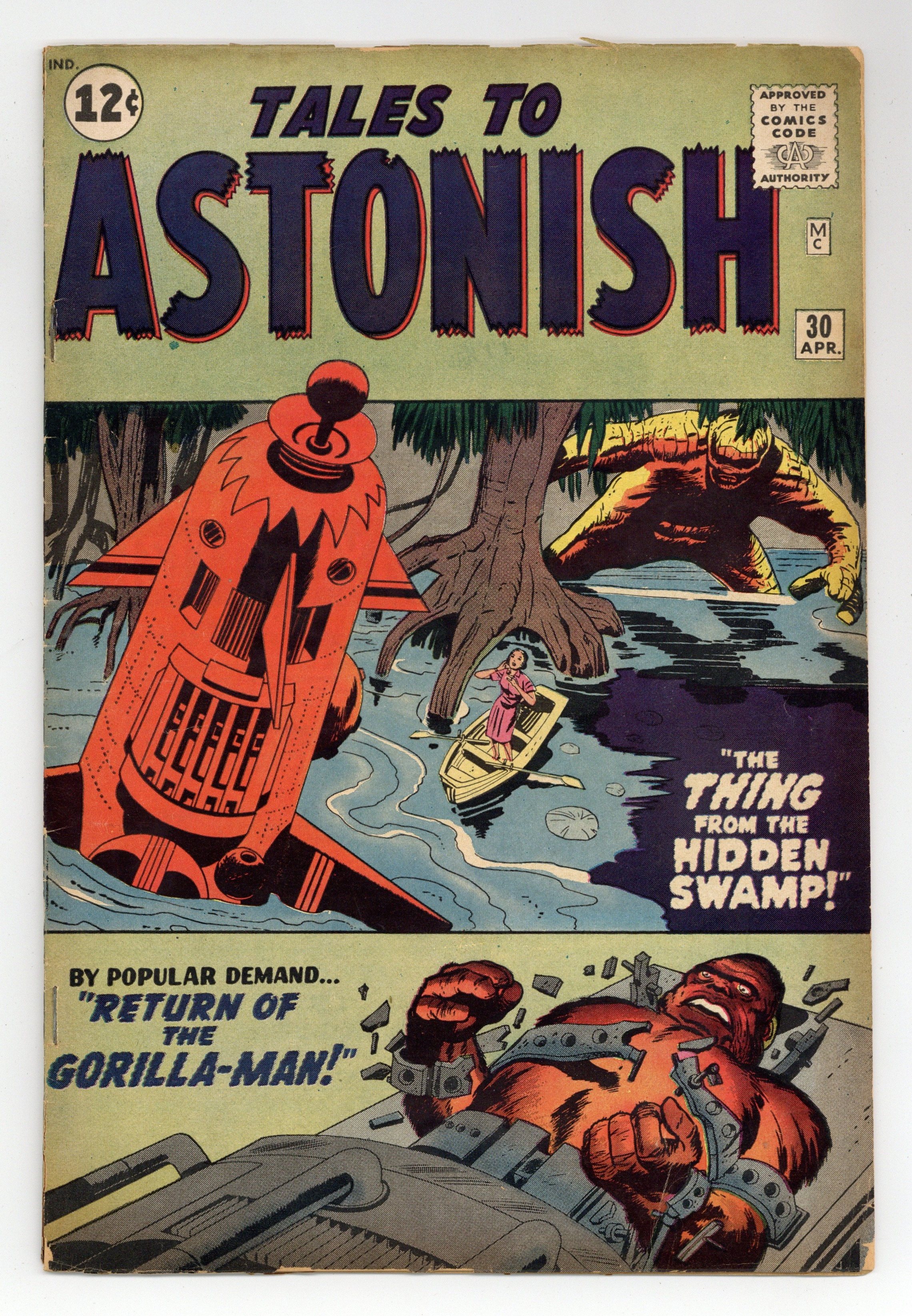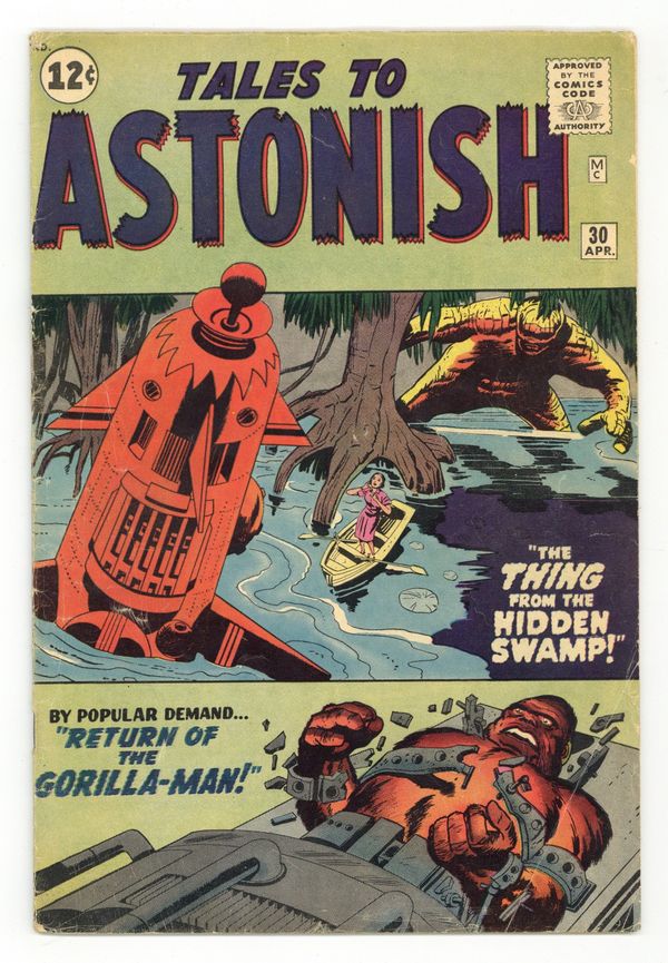Cover by Jack Kirby and Sol Brodsky. The Return of the Gorilla-Man, art by Jack Kirby and Dick Ayers; The Gorilla-Man escapes and tries to get himself transformed back into a human, but instead he is blasted into space in an experimental space capsule. The Remedy Oil text story, art by Marie Severin. The Thing from the Hidden Swamp, art by Jack Kirby and Dick Ayers; A plain girl helps a stranded alien, and is made beautiful as a reward. What Was the Staggering Secret of the 13th Floor, art by Don Heck; An oddly cheerful elevator operator is held at gunpoint with a passer-by by a spy planning to blow up the hotel. Quogg!, script by Stan Lee, art by Steve Ditko; A fugitive hides in an enclosure said to contain a horrible monster, and realizes too late that the monster appeared to be an ordinary hut. 36 pgs., full color. $0.12. Cover price $0.12.