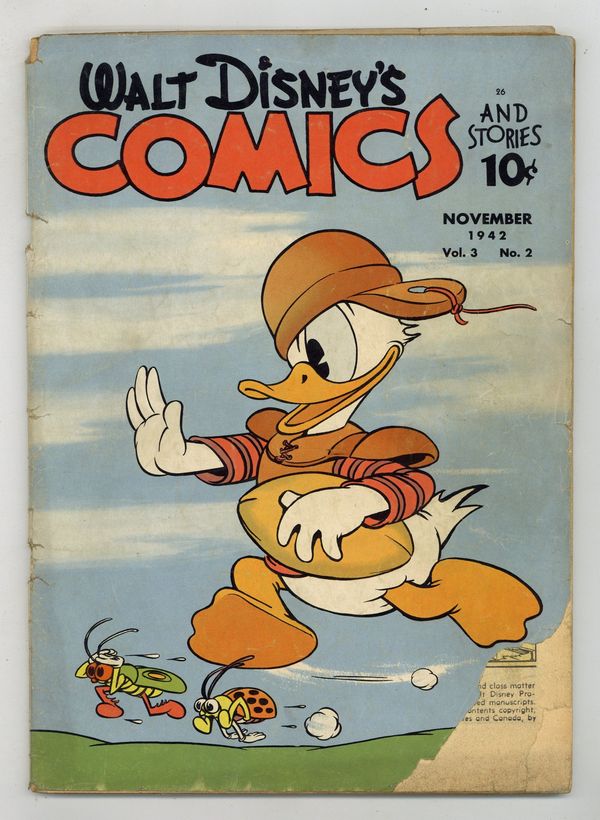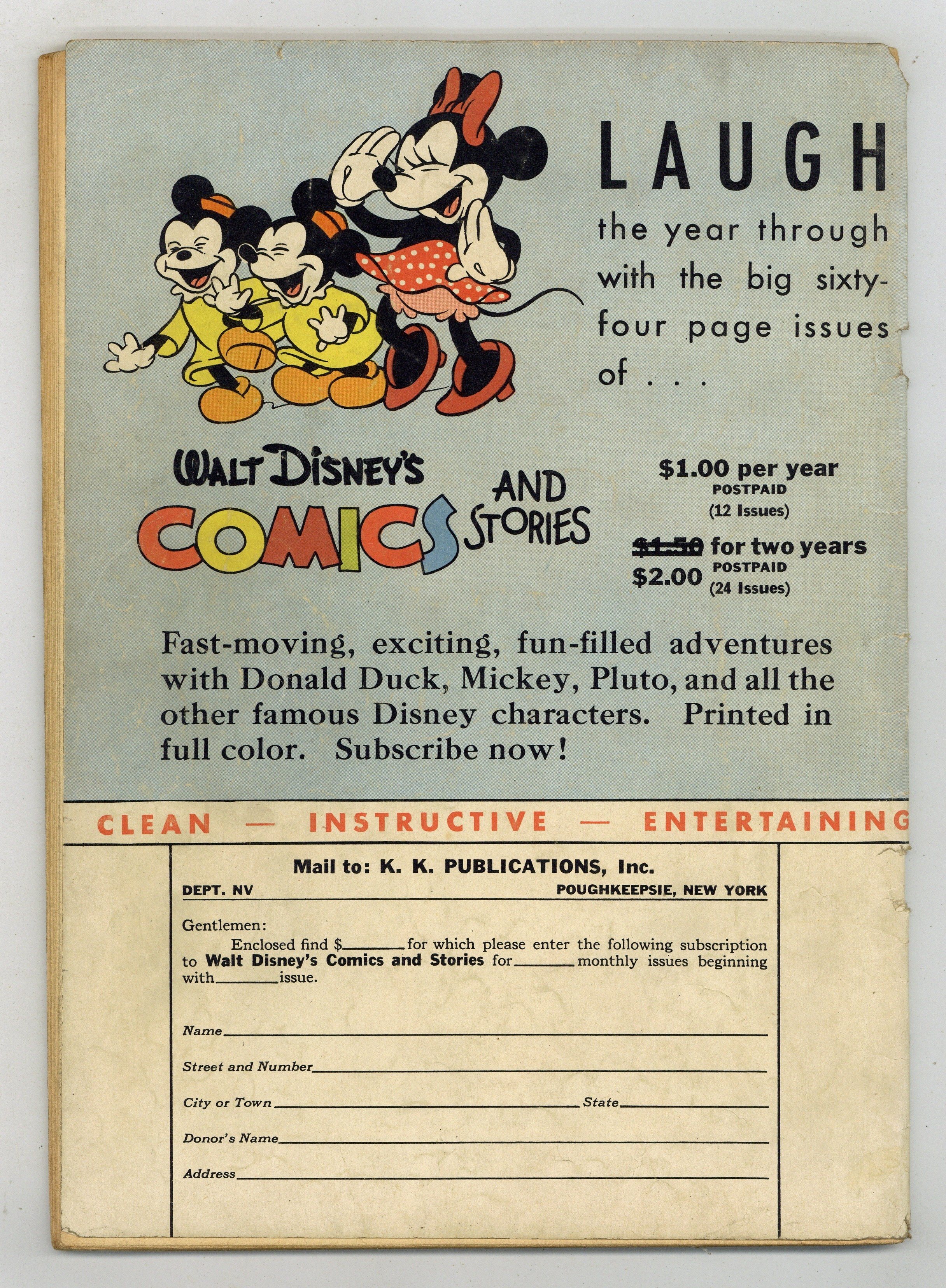 Cover by Carl Buettner. Stories and art by Floyd Gottfredson, Ted Osborne, Ted Thwaites, Merrill De Maris, Bob Karp, Manuel Gonzales, Bob Wright, Bob Grant, and Al Taliaferro. Sometimes listed as Vol. 3 #2. The long-running vehicle for Disney character comics. In a classic Floyd Gottfredson story from the Mickey Mouse comic strip, Mickey discovers that a mysterious force field prevents planes from flying over a hidden valley. Bucky Bug sails into Mother Goose Land and encounters characters from nursery rhymes. In one of several stories reflecting America's entry into WWII, Donald Duck can't listen to the radio because of air-defense broadcasts. A Bedtime Story; Bringing Home the Bacon; Dead End Kidder; The Heat's on; Donald's Tire Troubles; A Horse of a Different Color; Expensive Economy; Dead Letter Office; Poor Reception; The Vanishing Magician; Mickey Mouse at the Bar None Ranch; Hollywood Chatter; Farmers' Problems; Foiled Again!; Great Expectations; No Half-Way Measures; Overloaded; How to Be a Sailor; Mickey Mouse Movies; Boys Will Be - Girls!; The Wrong Combination. 64 pages, Full Color. Cover price $0.10.