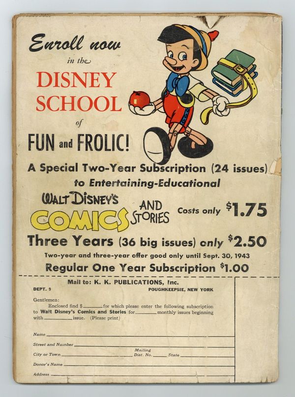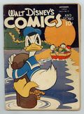 Starts Apr 20 Stories and art by Walt Kelly, Carl Barks, Floyd Gottfredson, Merrill De Maris, Bob Karp, Manuel Gonzales, Sylvia Holland, Bob Wright, Bob Grant, and Al Taliaferro. Sometimes listed as Vol. 3 #12. The long-running vehicle for Disney character comics featured early work by Carl Barks, the legendary Good Duck Artist. In a classic Floyd Gottfredson story from the Mickey Mouse comic strip, Mickey competes with Montmorency for Minnie's affections. In a story by Barks, Donald and his nephews compete to build the best animal traps, first for foxes, then wolves. In a story by Kelly, Gremlin Gus and the Widgets choose the wrong place to light a match. Plus a vintage ad for Disney's WWII propaganda film, Victory Through Air Power. The Mighty Trapper; Cousin Bertie; Financially Embarrassed; Carnival Fun; Contrary Condors; Weighty Wishes; Magic Stream; Alone at Last; The Gremlins; Mickey Mouse: Love Trouble; Hollywood Chatter; Tight Fit; Only His Hands Got Hot; Gentleman in Waiting; And Besides She's Left Handed; Two Strikes Is Out!; Faith, It's Wonderful; Bumpsy Daisy; Night Prowlers; It's Smart To Be Thrifty; #17 In The Ration Book; Strictly Legal; Donald Gets Stuck; He Was Warm; It's An Ill Wind; Empty Saddle; Time's Up!; The Retriever; Back to School; A Woman's Wiles; Plane Paper; On the Spot; Baby Needs New Shoes; Within the Law; Double Features; His Good Deed for the Day; A Hard Woman; Primer Page. 64 pages, Full Color. Cover price $0.10.